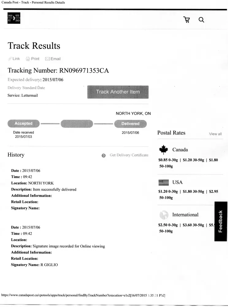 On July, 03, 2015, I paid for a package to be delivered Registered Mail; a valid signature was not provided by the recipient.