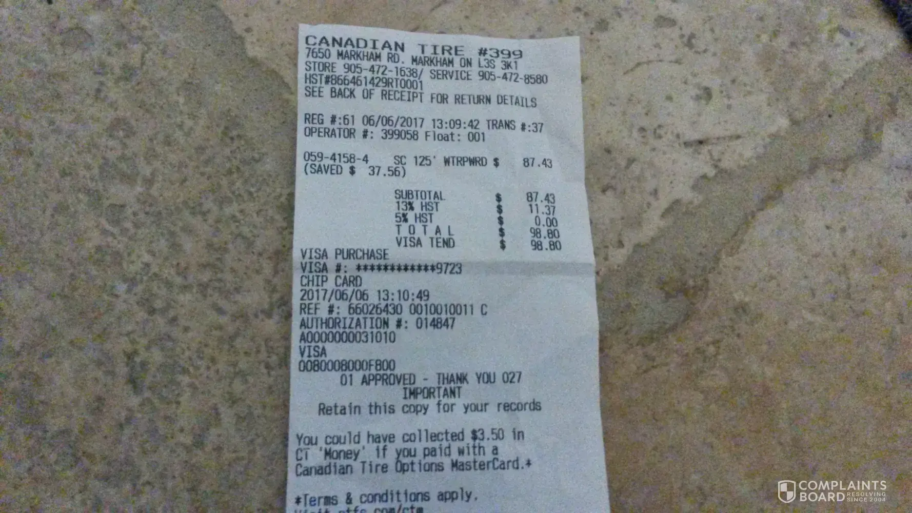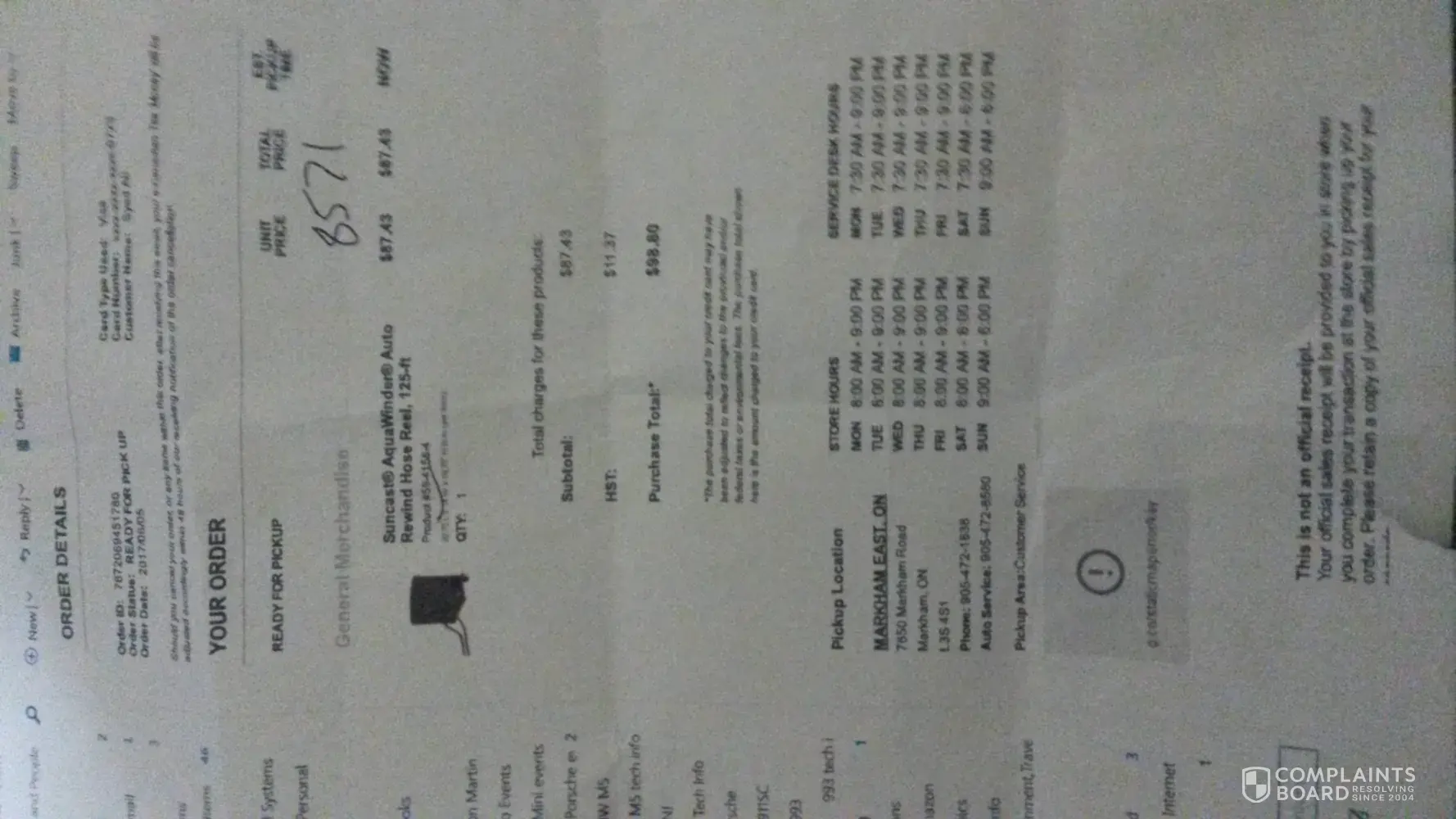 On June 5, 2017, I purchased a Suncast Aquawinder Auto Rewind Hose Reel online using Visa for $87.43 and subsequently received an email indicating the item was ready for pickup at the Canadian Tire located at 7650 Markham Road, Markham ON L3S 3K1.