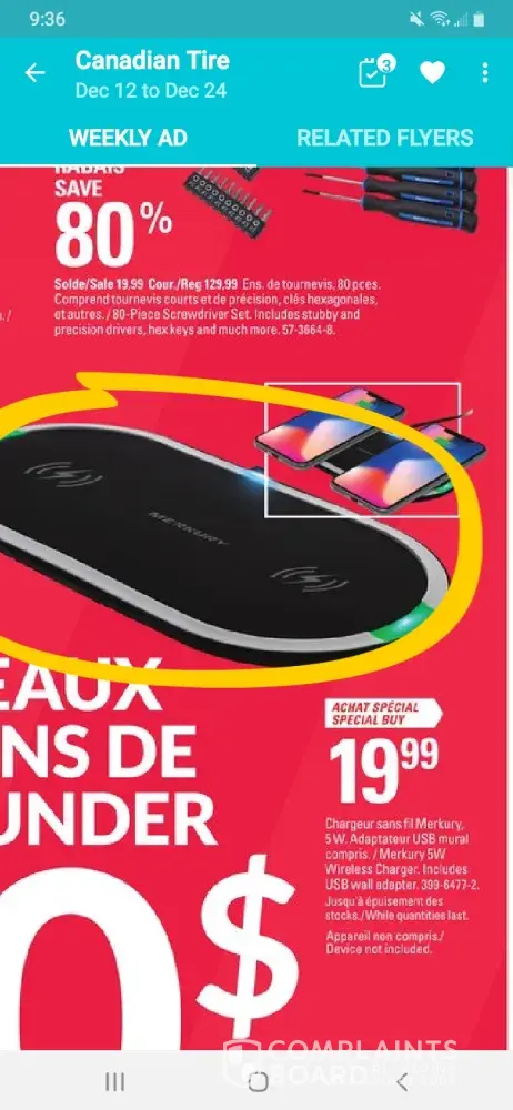 I whent to canadian tire this morningto buy a double wireless charger the day before they tell me they have it in the back but they will be on the floor this morning i go this morning and now they say they did not receive the double wireless charger and its in the flyer this is fals advertise if you dont have it dont put it in the flyer