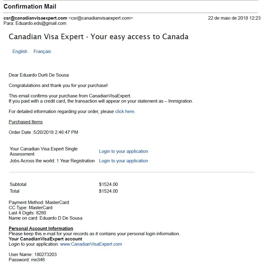 Now I'm claiming the refund of my payment for USD 1, 146.00. First, with my good bank in order to recover it and second with CANADIAN VISA EXPERT.