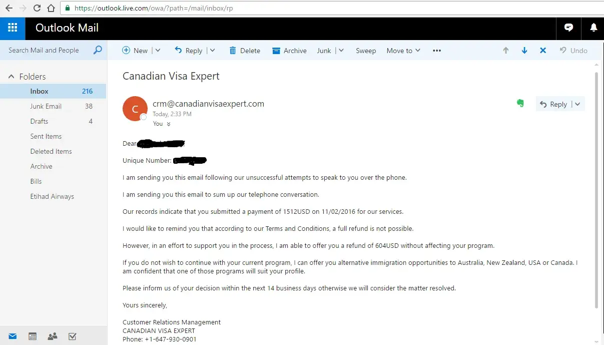 I am in touch with the Canadian authorities and I am making this case known to the government. You can help endorsing my case with the authorities. Please send your contact to my email below and soon I will add you in an active community that was scamed from Canadian Visa Expert, and I will demonstrate that this company does not act in good faith.