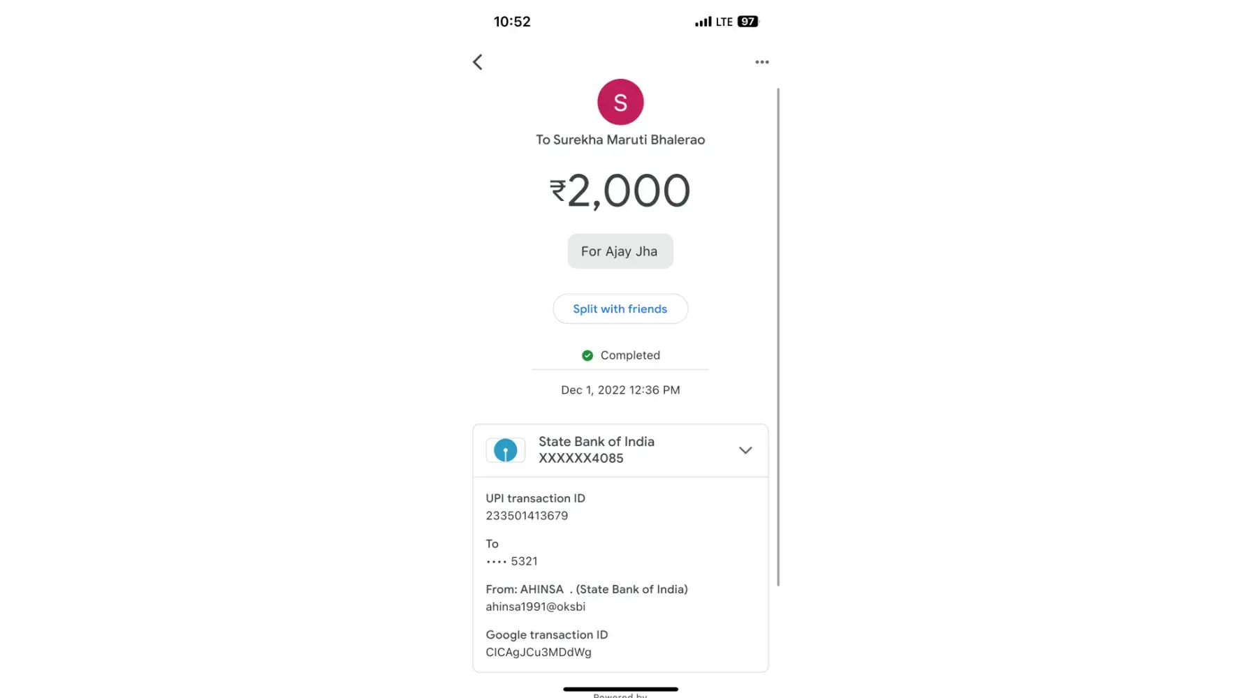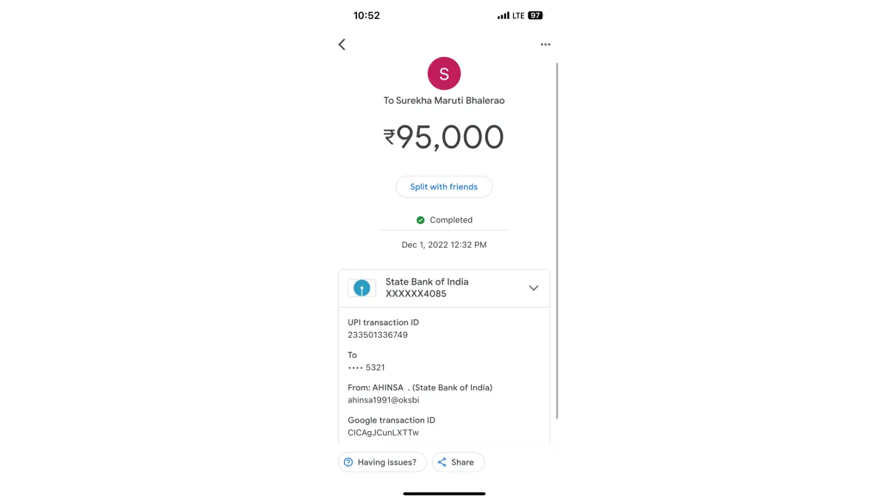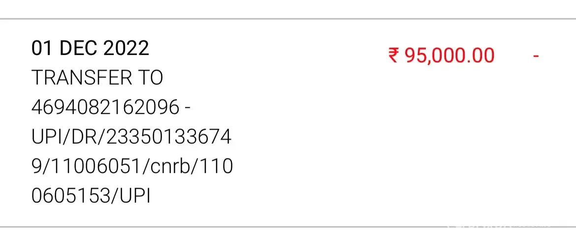On 1st December, I was victim of online fraud which I realised today when the Fraudster tried to dupe me again. I transferred INR 95000 and INR 2000 via Google Pay (screenshot attached) RO the below mentioned Account :
