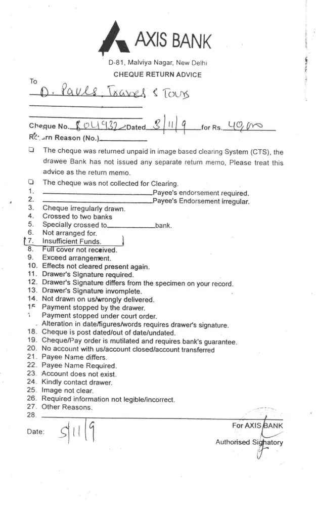 I have given a cheque (no - 804932 dated - 3/11/2009 represented on 5/11/2009) of rs. 40'000 /- of yours bank as an booking amount of 6 persons to a holidays package company but few days later I got a call from that package company that your cheque is bounced & when I asked them the reason for bouncing, then they showed a letter from ' axis bank ' saying ' cheque return advice ' & the reason mentioned in that letter was ' insufficient funds '.