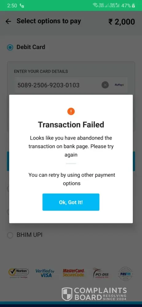 I do 1 January 2019 a 2000 rupees transaction other person.I lost my money but other person did not received money. It problem are make many time and money not received now