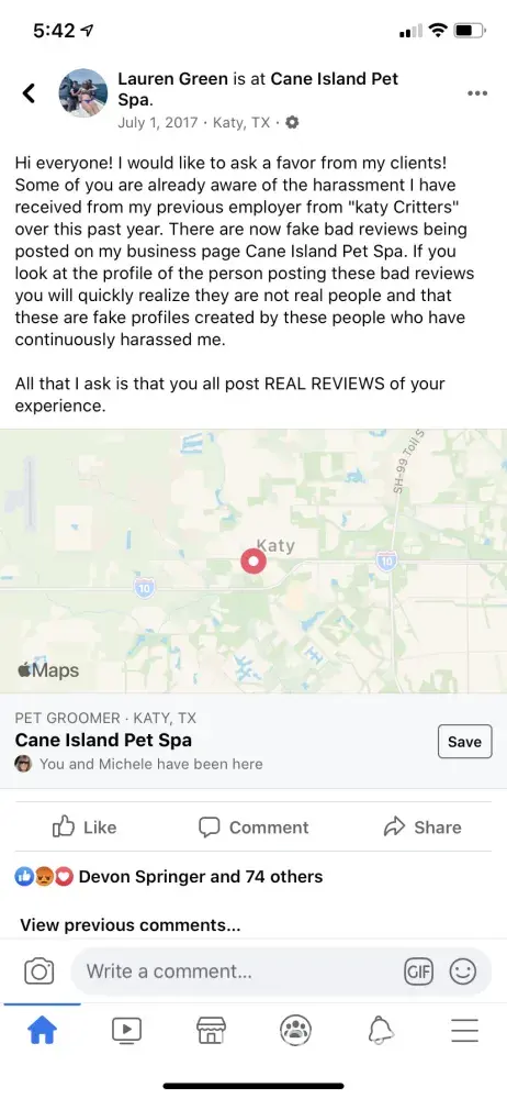 Any way back to the CANE ISLAND PET SPA NAME. WHY oh WHY would Lauren EVER CHANGE the name of her business?! She's hiding complaints. A multitude of complaints, dog injuries and so forth. And the attachment shows the REALITY of the TRUE REVIEWS... not fake. The town of Katy is very small. To start your company and then months later, CHANGE your business name? It's super revealing. Lauren had to cover up a lot or she would be sued.