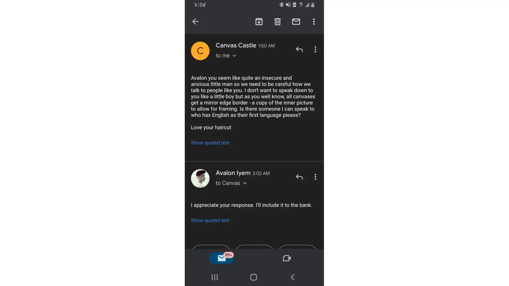 "Avalon you seem like quite an insecure and anxious little man so we need to be careful how we talk to people like you. I don't want to speak down to you like a little boy but as you well know, all canvases get a mirror edge border - a copy of the inner picture to allow for framing. Is there someone I can speak to who has English as their first language please?