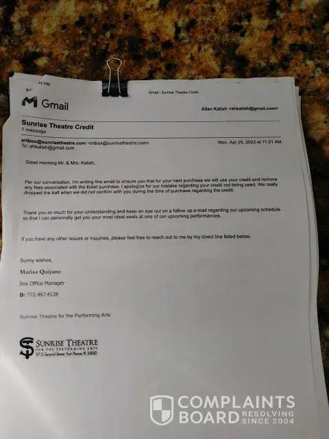 Desired outcome: Want credit 4 unauthorized $140 (See email-Sunrise Theatre). CC rep misinformed/misguided. Theater committed fraud. CC co. encouraged changes; disadvantageous. Calculated-too late to change to initial claim.