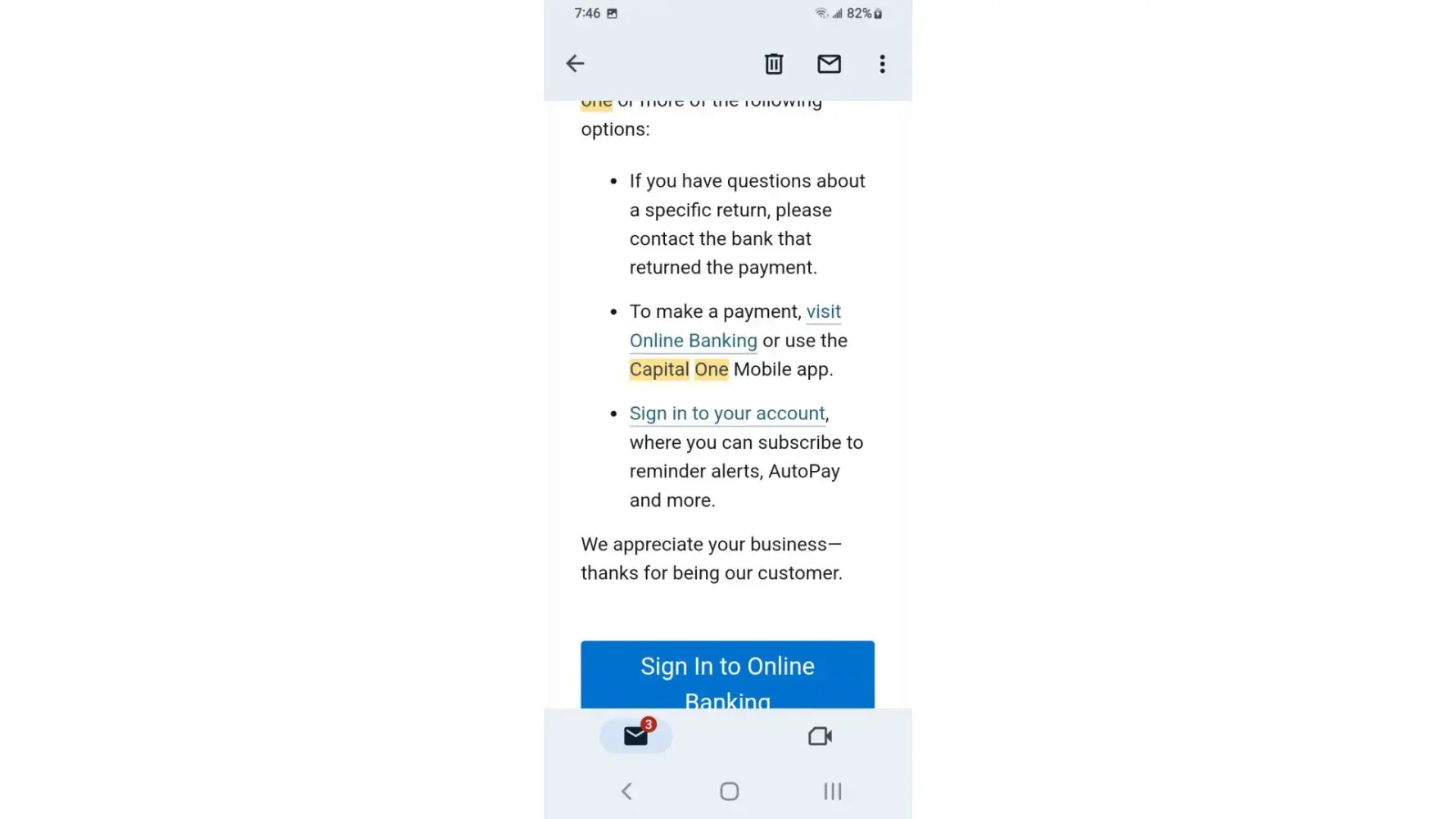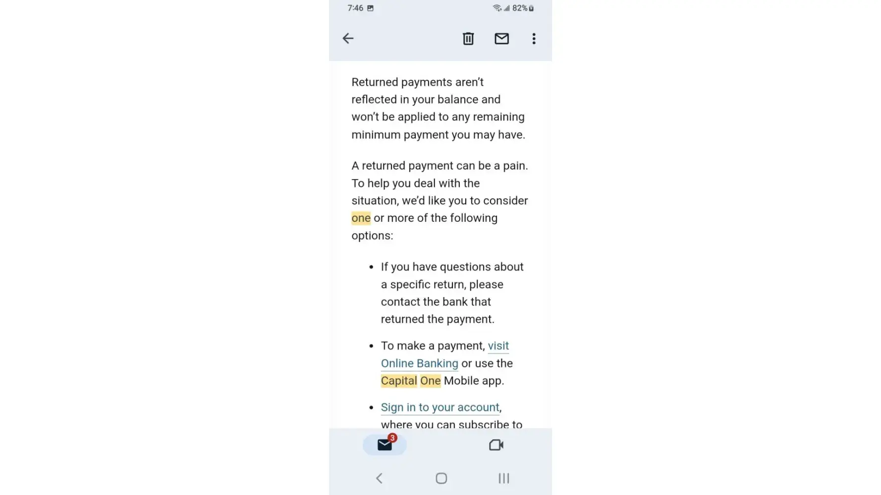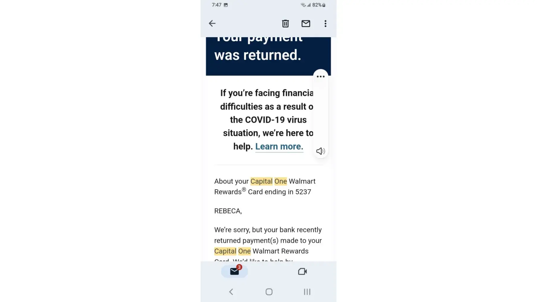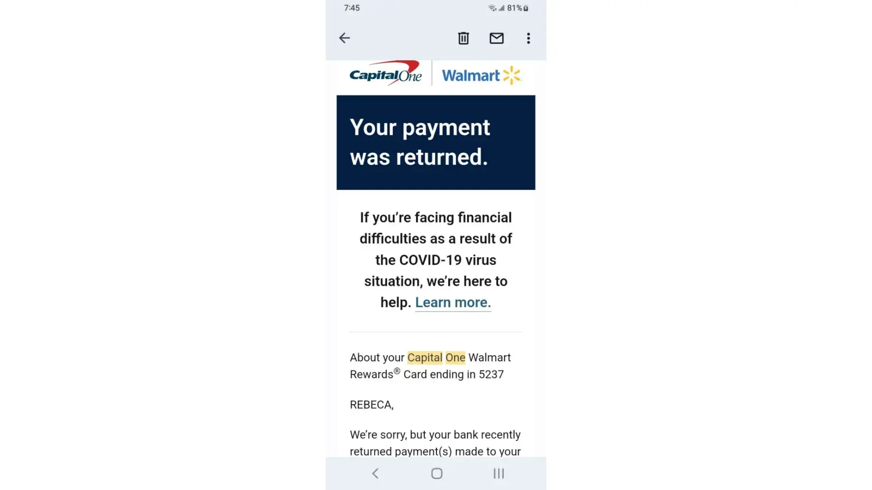 I've received a lot of email claiming my payment had been returned by bank the mobile app as well as Capital One website remaining credit balance reflects email yet the payments have cleared the bank and shows on statements I phone customer service who honors the email someone nearby claims the owner of Capital One is Richard a hostage held in Millcreek canyon near downtown Salt Lake City area I overheard while outside smoking at designated smoke area.
