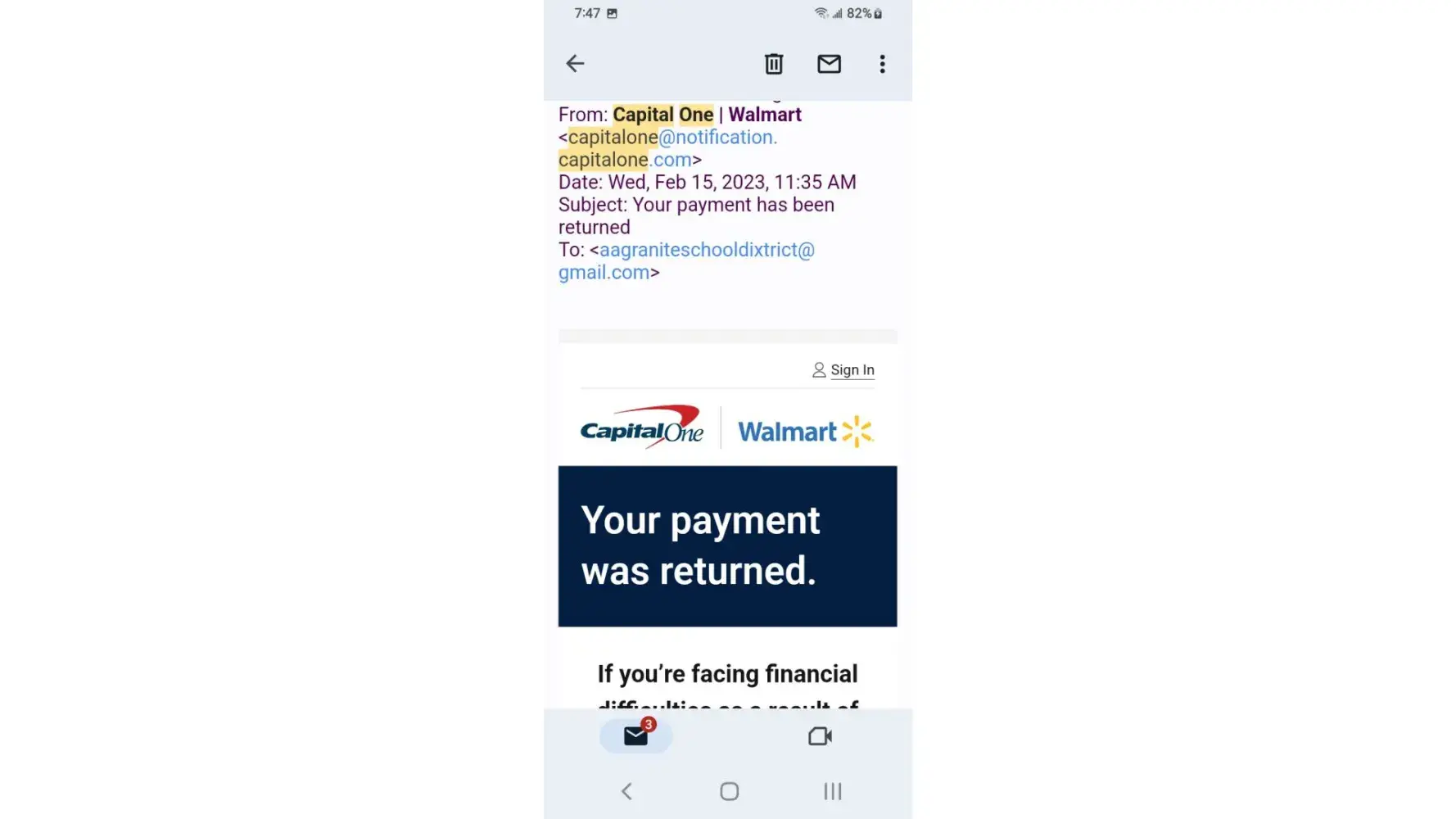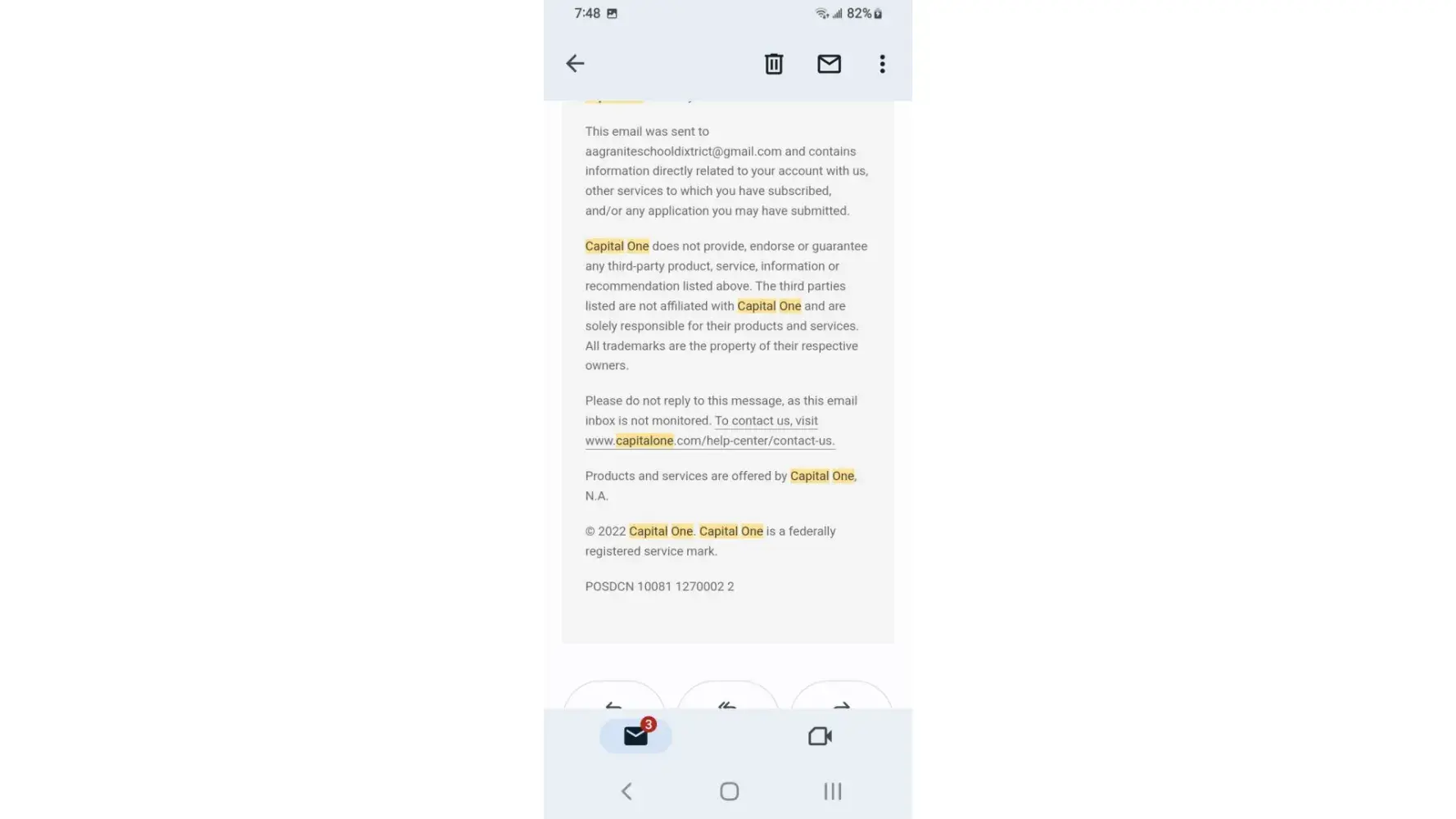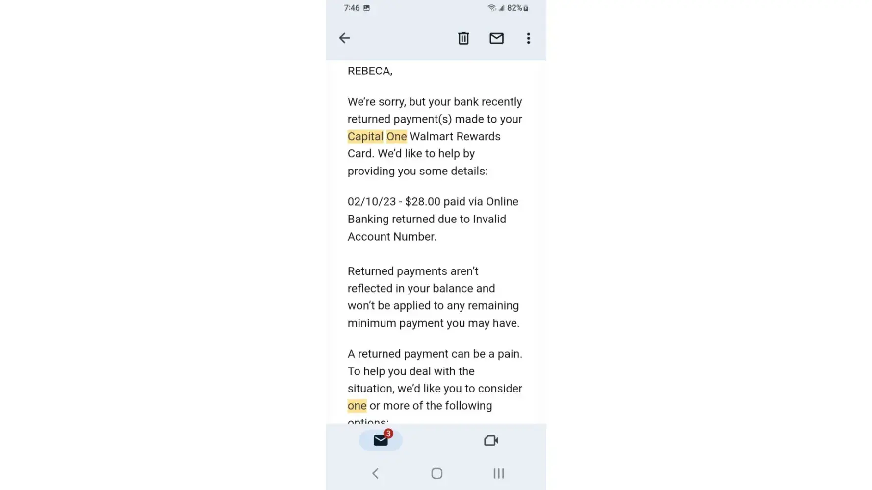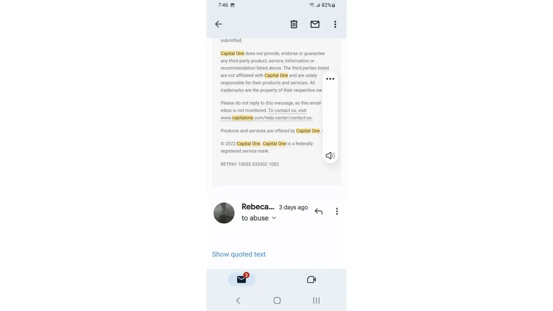 I've received a lot of email claiming my payment had been returned by bank the mobile app as well as Capital One website remaining credit balance reflects email yet the payments have cleared the bank and shows on statements I phone customer service who honors the email someone nearby claims the owner of Capital One is Richard a hostage held in Millcreek canyon near downtown Salt Lake City area I overheard while outside smoking at designated smoke area.