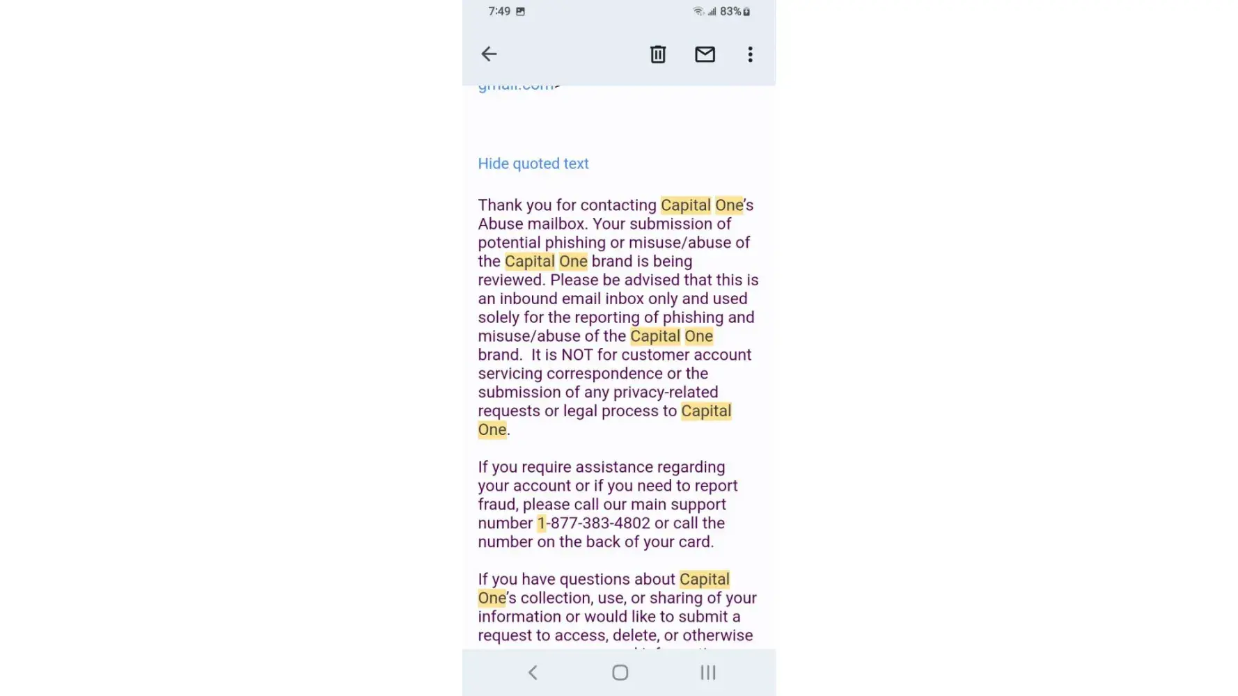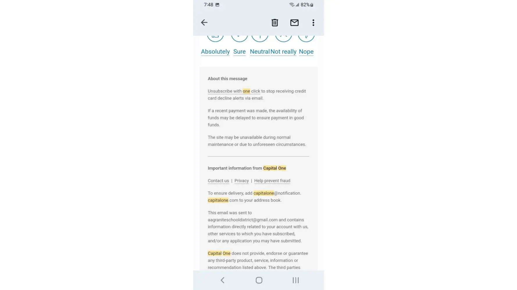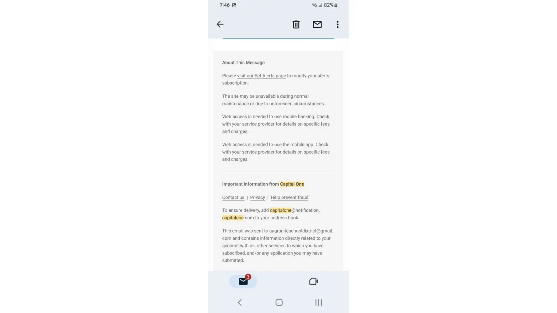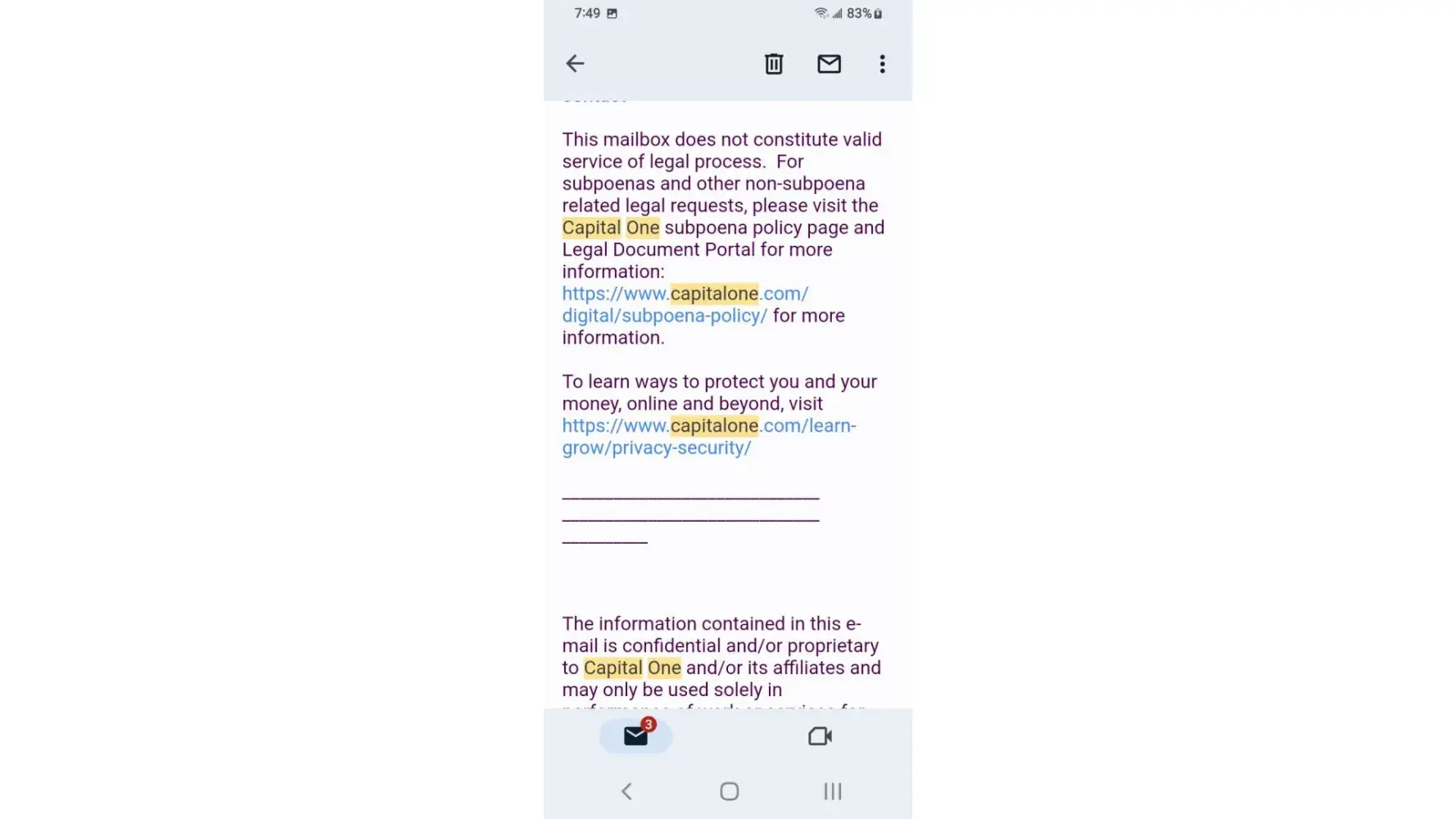 I've received a lot of email claiming my payment had been returned by bank the mobile app as well as Capital One website remaining credit balance reflects email yet the payments have cleared the bank and shows on statements I phone customer service who honors the email someone nearby claims the owner of Capital One is Richard a hostage held in Millcreek canyon near downtown Salt Lake City area I overheard while outside smoking at designated smoke area.