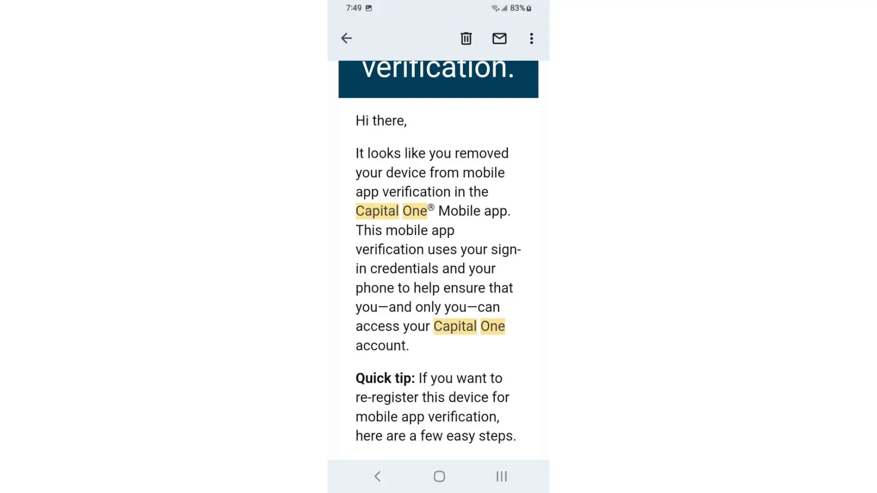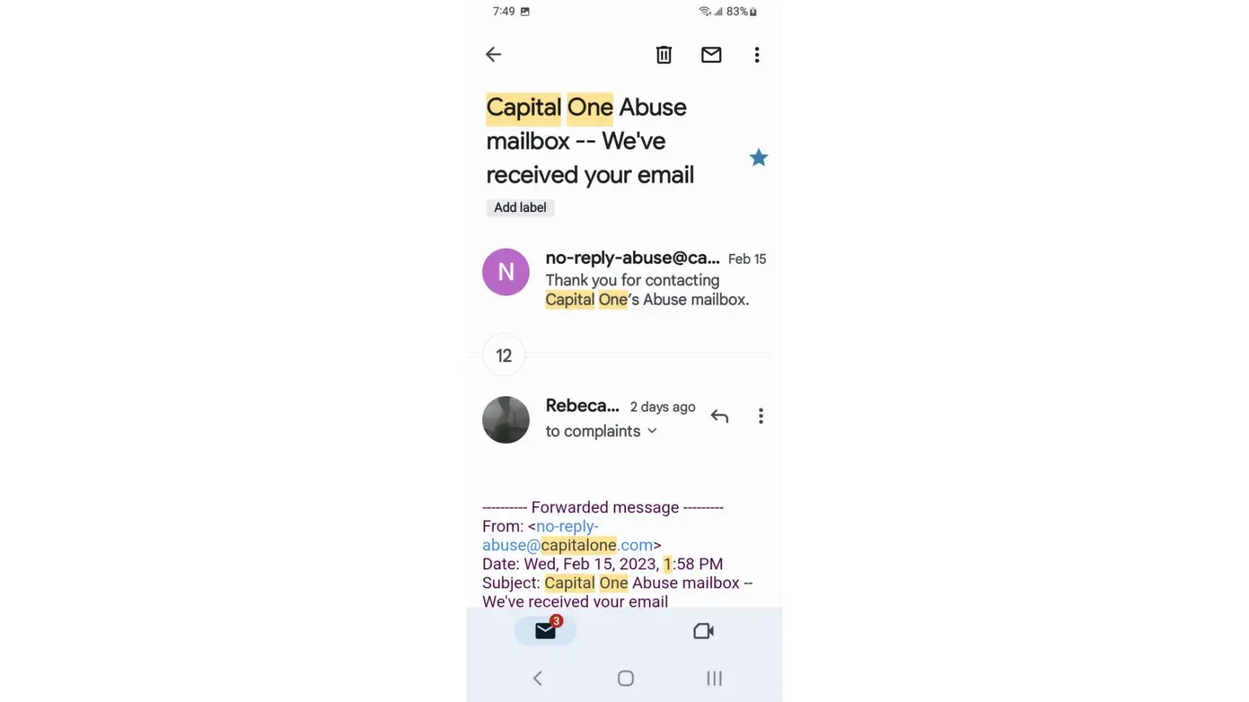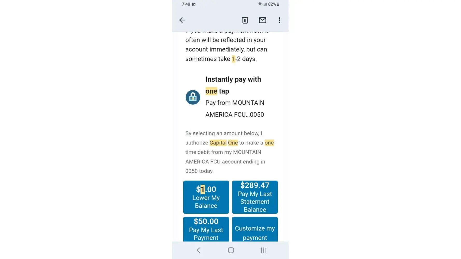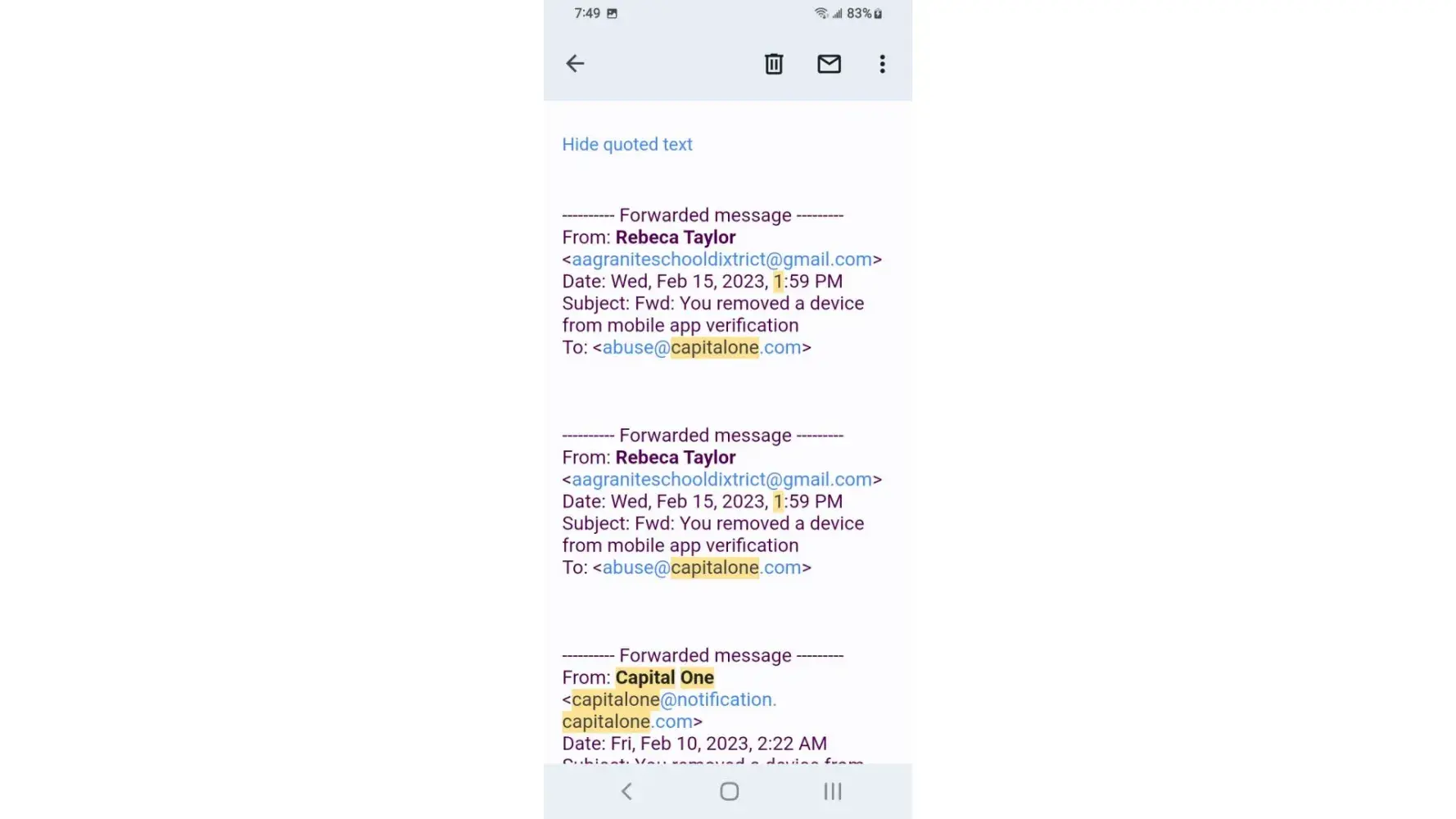 I've received a lot of email claiming my payment had been returned by bank the mobile app as well as Capital One website remaining credit balance reflects email yet the payments have cleared the bank and shows on statements I phone customer service who honors the email someone nearby claims the owner of Capital One is Richard a hostage held in Millcreek canyon near downtown Salt Lake City area I overheard while outside smoking at designated smoke area.