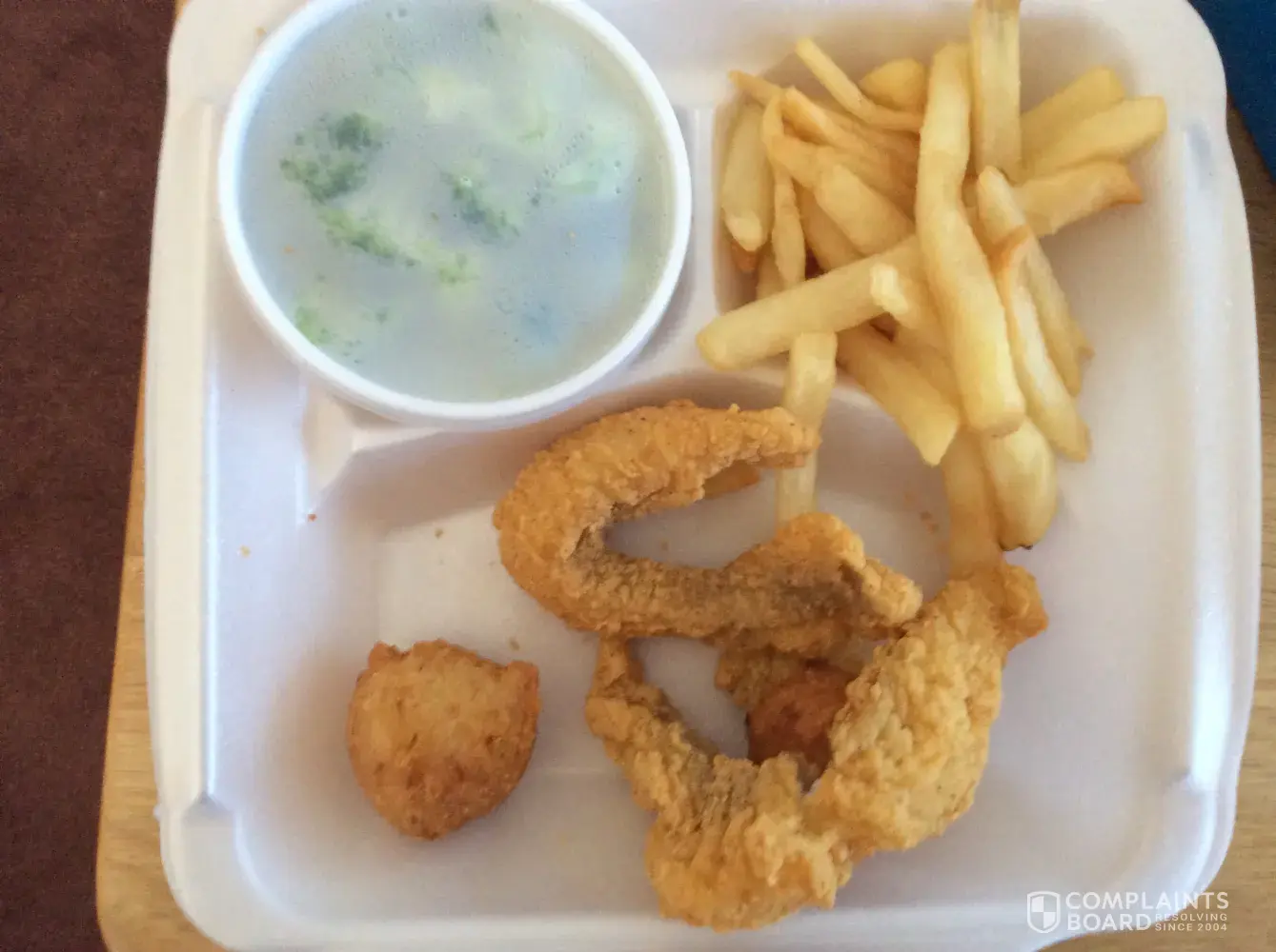 When I got home I noticed the lettuces in the side salad was brown and the green beans tasted salty. The fish tenders were not hot and fresh.