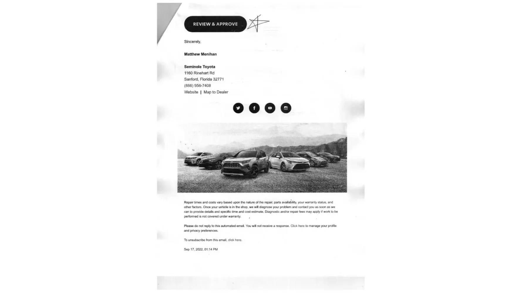 On 09/13/23, my car was taken into Seminole Toyota for service. I was advised that in addition to the oil change, it needed the Brake System Fluid Exchange, which we had they do. Upon leaving my service advisor said the Dog Bone Mount needed replacing due to its wearing. On 9/17/23, I was emailed the Multi-point Inspection report, which included further...