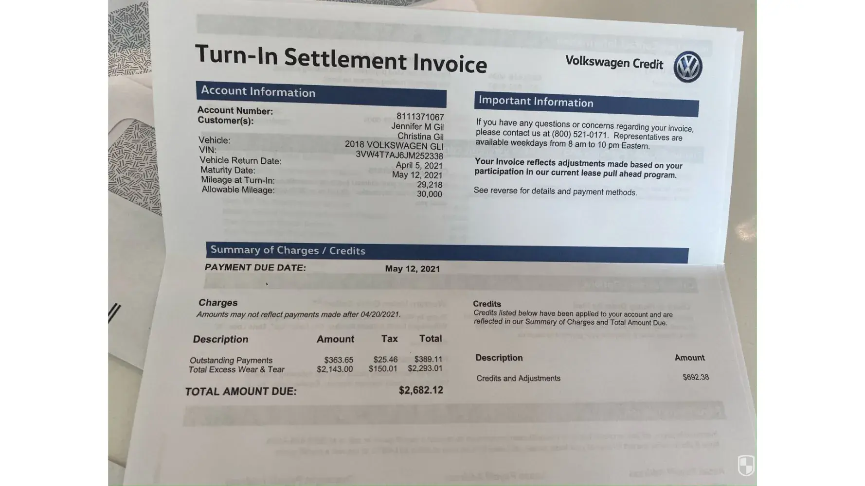 Hello, My name is Christina Gil and I am emailing about a balance that has been sent over to AFNI by Volkswagen Credit. My Volkswagen Credit account number is [protected]. The bills specifies the following : $389.11 for outstanding payments $2,143.00 for wear & tear My vehicle was leased with Alessandra Stanzione on March 27, 2021. The bill wa...