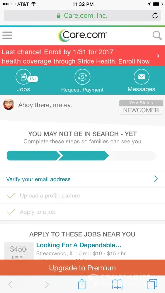 It is my opinion that Care.com is nothing but a scam, suckering people into paying for monthly and upgrade fees with the promise of potential work, or of nurturing caregivers or hardworking housekeepers. Care.com claims that anyone can join for "free" but neither you nor the person you want to hire (or person you want to be hired by) can communicate with each other until BOTH of you pay to upgrade and pay their monthly subscription fee. Well, what would be the point of joining if you're never planning to contact anyone on the site? After I signed up (for "free") and then paid for the subscription and upgrade, I not only never got any replies to any of the jobs I applied for, but no one ever even looked at my profile - yet the "jobs" remained open. I believe that Care.com is setting up fake profiles in order for people to think that there are legitimate accounts and therefore shell out money for the monthly subscription and upgrades. It's akin to tying a carrot on a stick in front of a donkey pulling a cart: It's a promise of reward that's always just out of reach. Once I started researching, I found countless similar complaints on Care.com's own community board, on the BBB site, and on several online consumer complaint sites - which only substantiates my assertion that Care.com is a scam. I have also filed complaints with the FTC and the Massachusetts AG (where Care.com is based), as well as disputing any charges on my credit card.