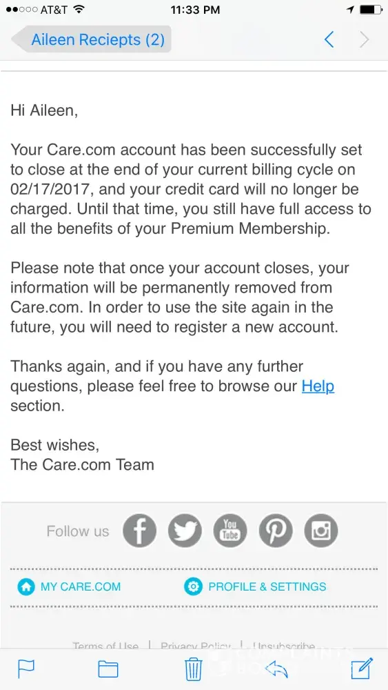 The short of it is, this website is a total scam. They have poorly written, easily misunderstood language in their terms and conditions that provide them with loopholes to not allow businesses to cancel their accounts. We signed up for a subscription service with them and after 2 months we knew that this was not producing the results that we needed. I tried to go on my profile and clear my info, turn off auto pay, downgrade my account, and close my account. I thought it was completed, but the next day I received an email thanking me for renewing my subscription. I was quite confused and went to log onto the site and it said my password was wrong. I called the number they listed to call and got some unfortunate soul named "Michael" from the Philippines who told me care.com doesn't allow customers to cancel their accounts.