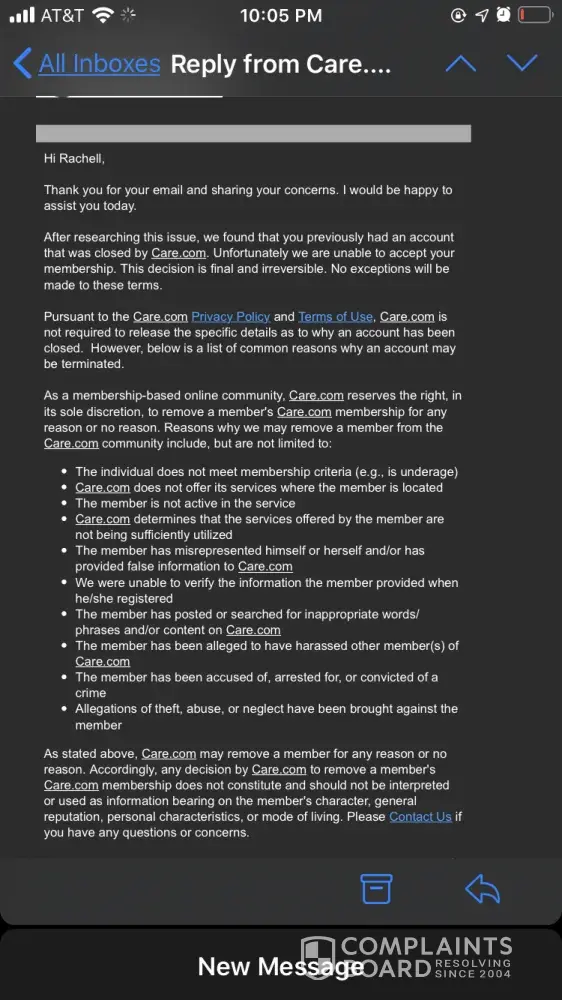 I signed up for care.com and paid for the premium service. I found a job as a personal assistant quite fast and I still continued to pay for my membership but after I started my job I never signed into again for quite awhile until recently because my client became terminally ill and moved away.I signed back into care.com or at least tried to and found out my account was terminated. I called customer service and they said they cannot tell me why I was terminated. I did nothing wrong, I have a squeaky clean background record, excellent references so I'm dumbfounded as to why they did this. I tried getting around by making numerous accounts each time paying for the premium service and within 2 days I was terminated again and again. I'm recently widowed so I will probably be living out of my car soon. This is ridiculous and I should have the right to know why I was terminated.