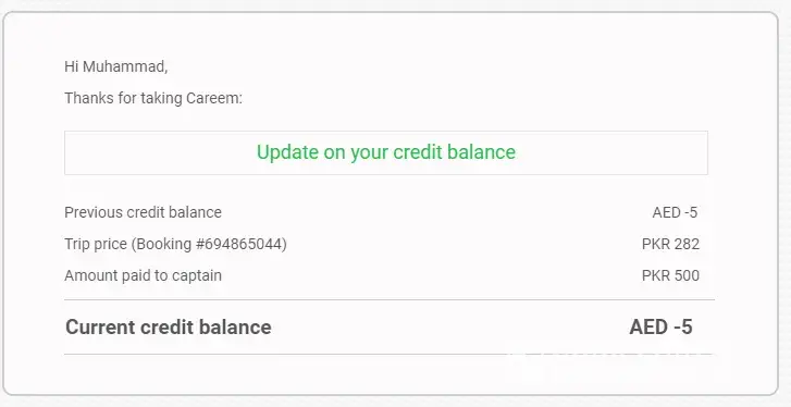 But my wallet is still showing a negative credit of aed -5. I have the email from careem showing all the details. Kindly fix the issue asap and add possitive credit in my wallet.