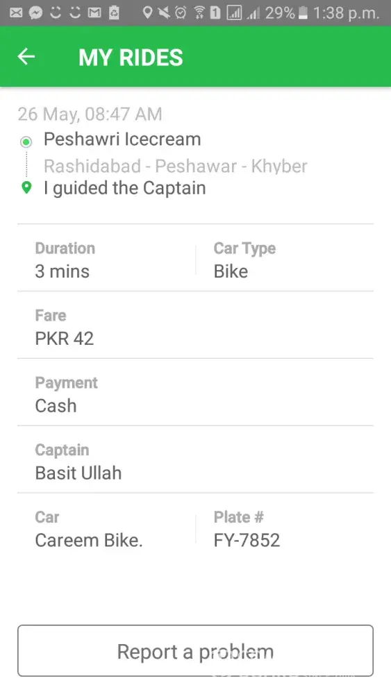 sir ma na peshwer ma ride ke hy... mujh agriculture university peshwer sa MPA hostel jana tha .. sir captain na mujh sa ak time py 2 rides le. or rasta rasta ma us ki ghadi band ho jati thii .. ma na yah sub kuch compromise kiya q k mera sth family member thy.. or mujh mpa hostel jana tha jo k sadar sa tohra ahgy hy lakin captain na mujh adah rasta py uthar liya.. phr udhr sa ma na raksha kiya usa b 120 rupy da kr apni distination tk pohnch.. its not behave good. sir 250rs estimate tha or us na mujh sa takreeban 300rs liya... sir ma cream ka regular customer hun.. or mujh bahrii afsos sa yah khana phr rha hy k us k bd ma na cream ki service ko unstall kr diya.. or ma ap local texi ka istamal krta hun.. jb tk mujh yah piasa vps nhi hota ma cream use nhi kru ga.. thanks.. think about it.. agr esa ap k sth ho jay to ap kiya kry gy...