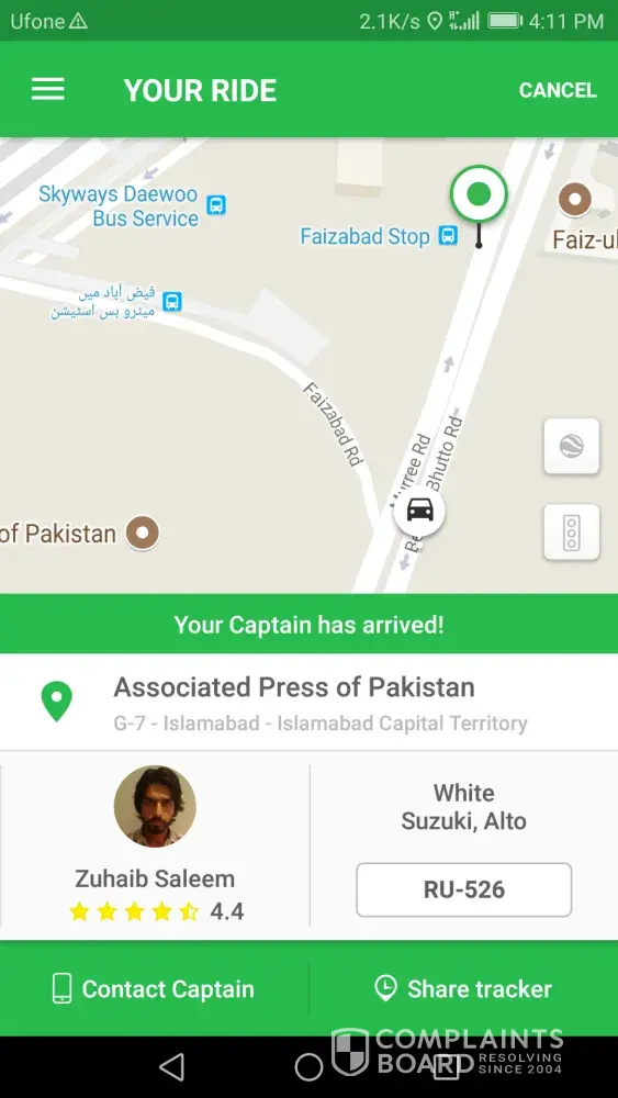 My name is Faique Ali and from Rawalpindi, Pakistan. I booked a ride on (04-Sep-2017 round about 4:00pm) from Faizabad Stop at the Road towards Islamabad. A driver named "Zuhaib Saleem" (Contact no. +[protected]) ( Car: White Suzuki Alto) accepted my request without even checking my pin location & when i called him "Bro where are you" ? He said "at your location in my white alto" when i looked at the map he was very far from my location so i thought maybe due Eid-ul-azha there are some issues on careem's server and after that i searched his car on the road but didn't find him, then i get to know that there's no issue in careem's server, it was the driver who didn't even checked the pin location or maybe he's unaware of that. Actually he was Standing on the wrong side of the road, i gave them my pin location on the road towards Islamabad (Murree Road, Rawalpindi) i had to go to Zero Point, and he was standing on the road towards Rawalpindi, i was getting very late and there were bars between Two opposite roads and also the U-turn was far from his location. I asked him to cancel the ride and then i had to go through a taxi which is Far better then this. And a negative balance of PKR 105 charged to my account unjustifiably. Now how could you justify to this act? Why didn't captain check the Pin location before accepting the ride ?