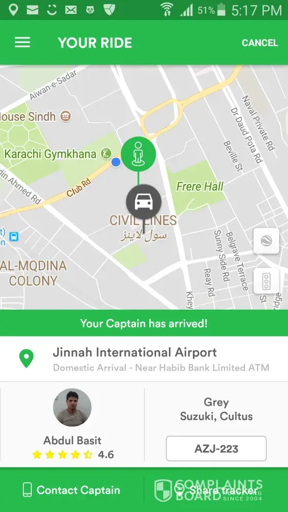 I hired your service at Karachi on 05.07.2017 and requested for pick up from Qasr e naz club Road Karachi to Jinnah international airport Karachi. The captain alloted to me Mr. ABDUL BASIS vehicle no. AZJ223 cheated me . He didn't reach me at my location and cancelled the hire of himself before reach me. Therefore the amount of penalty was unduly charged to me. He wasted my time and I missed my flight as well. I complained immidiately at your customer service at Karachi by phone and registered my complaint but in vain. Kindly address my complaint immidiately under advice to me and oblige.