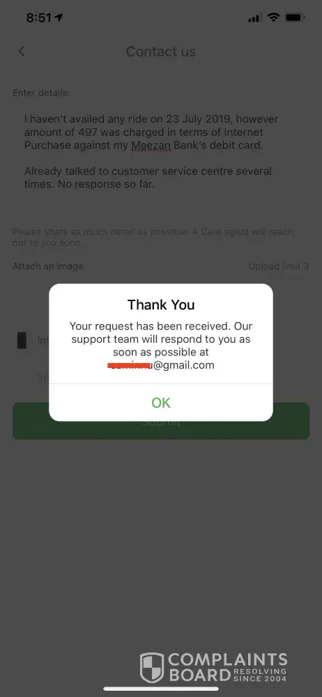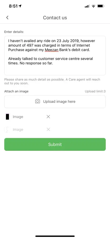 I contacted careem's helpline, subsequent to meezan bank's helpline, he checked my careem acoount's history but surprisingly there wasn't any ride/package availed on 23rd of july 2019. I asked him to probe into this purchase thoroughly that who performed this transaction, careem representative said that he don't have needed access to probe further and told me to "report a problem" using mobile application, mention all the details you have, add relevant screenshots of transaction and email you received. I followed the course but not received a single callback or a word from careem network on my complaint. I repeatedly raised this issue for many days, explaining problem faced every time to different representative, I even talked to careem service centre's supervisor, he assured an update on my complaint within 24 hours time span and never called me back.