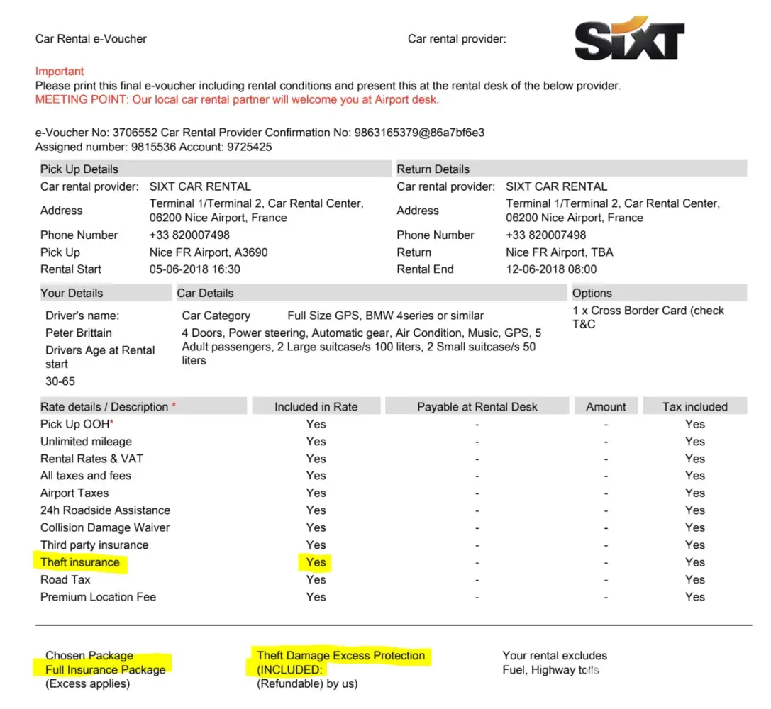 Sixt operator at Nice airport informed us that NO insurance was included including theft etc