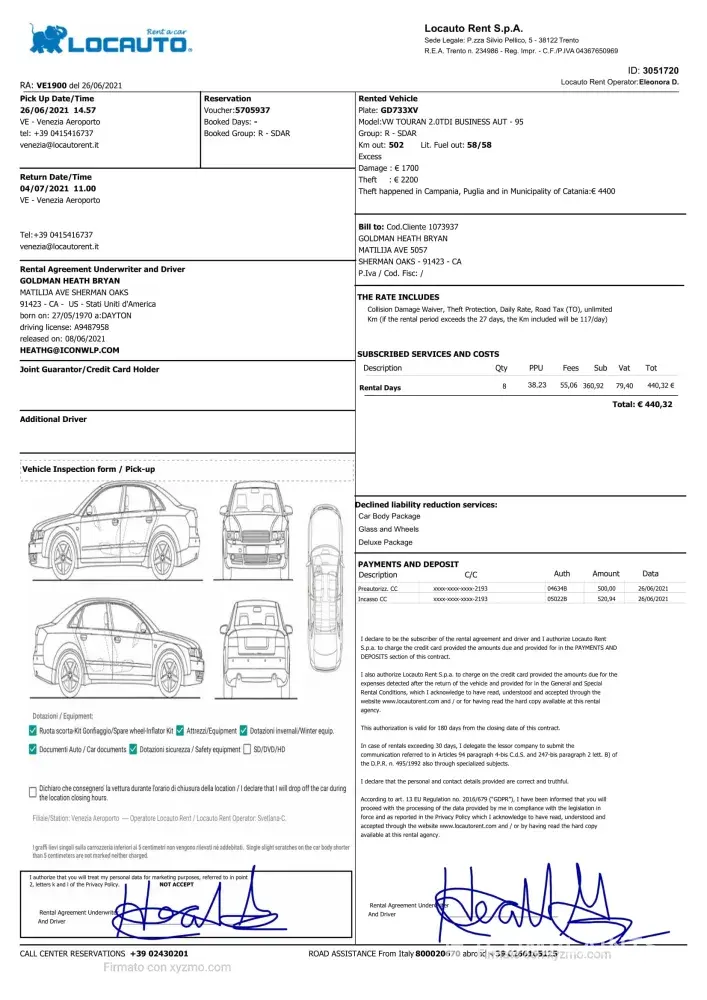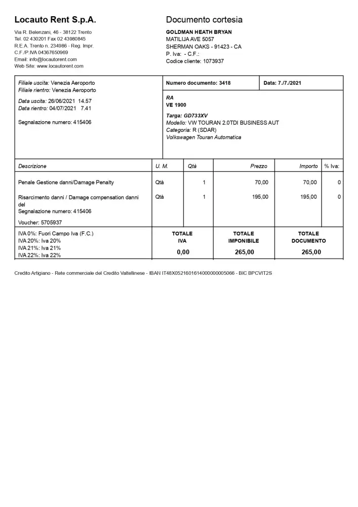 i have gone back and forth with Locautorent Venice airport Italy on damages being charged to my client Heath Goldman. when returning the car there was no mention of damages and then received an invoice and credit card being charged for 265 Euros. We took out premium access insurance for this I have gone back and forth with them and also have sent you an email but no response. the service is something to be desired. I finally received back in regards to the claim from Locautorent and I am attaching this and the other documents. We are talking about voucher number 5705937. my email is: [protected]@inter.net.il