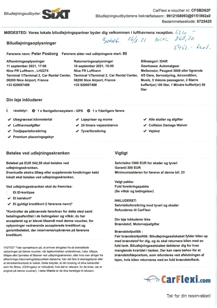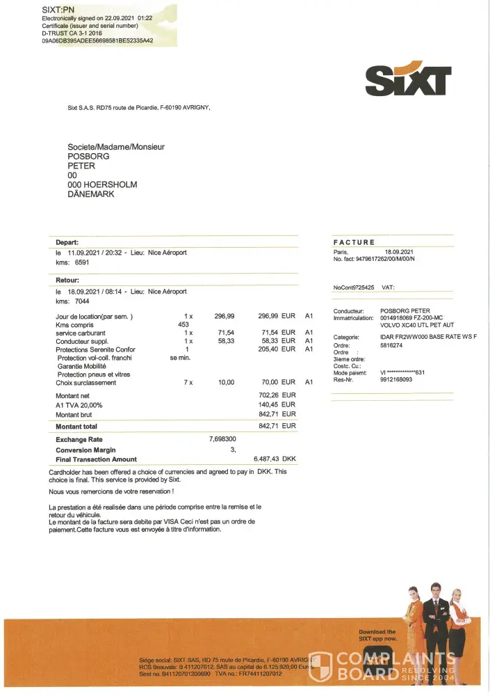 Facture from Sixt 18.09.2021 DKK 6.487, 43 - enclosed.