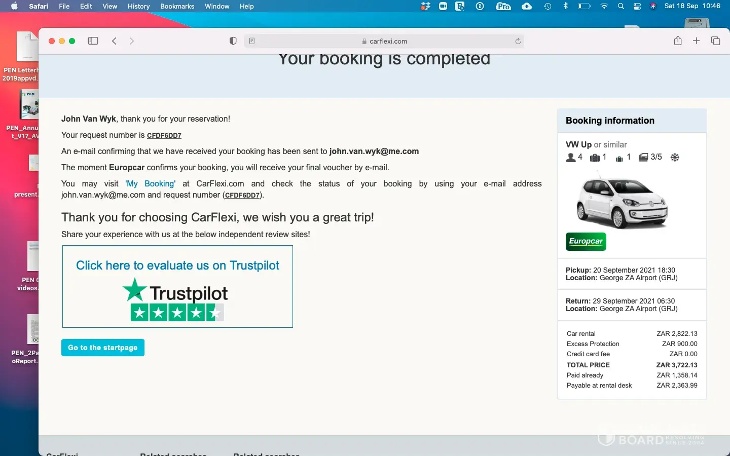 You quoted us for R3 722. My father that is 84 years old, were scammed into paying double that for the car he rented. I have proof of the quote. See attachment. He thought he booked at Europcar, but was directed to your service. I think it is really sad and terrible that you did not even respond to my previous email. Pls find the details of the booking in the attachment.
