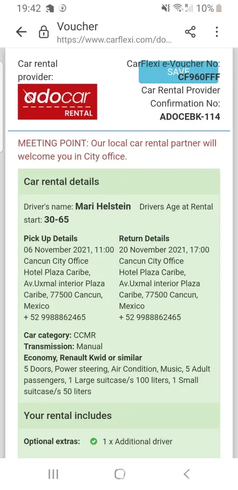 5. I didn't get any solution from Carflexi (the phone number at the webpage was not connecting) nor from Adocar (company, where the rental car was supposed to come), so I needed to get a totally new car rent as I had my plans already made to leave Cancun. Which means I paid double for car rent.