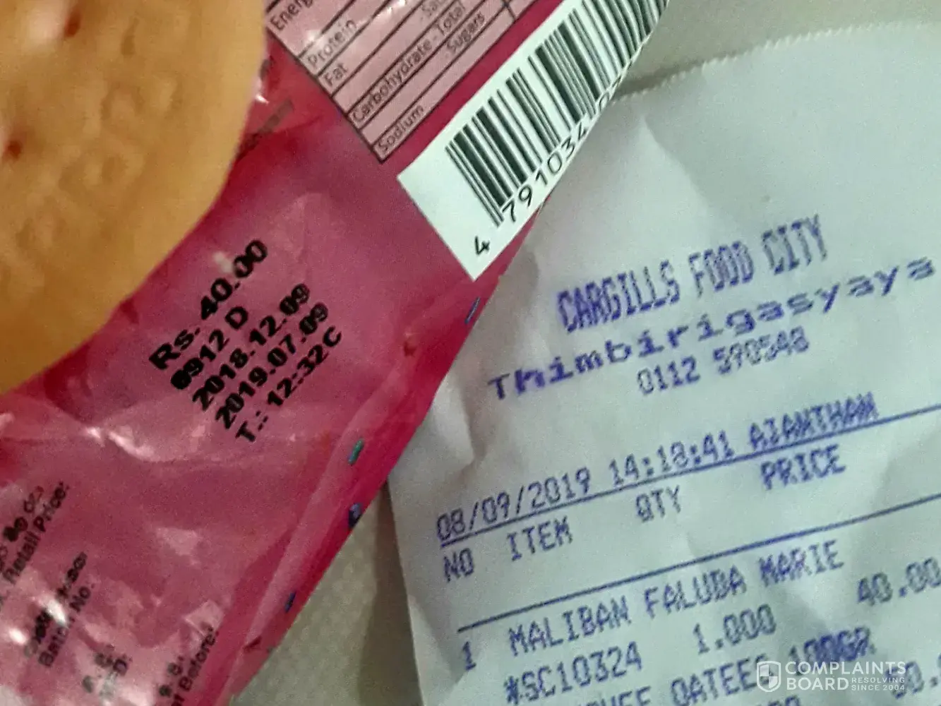 I Have bought a maliban faluda marie biscuit packet today (2019.09.09) from Thimbirigasyaya cargills foodcity, Unfortunately I couldnt to watch expire date on that time.After I came home and opened the packet and gave some biscuits to kids.There were complained to me that the biscuit was sticky .After I watched the expire date.It was expired, the date was 2019.07.09. I know that was a my mistake that I have to look the expire date.