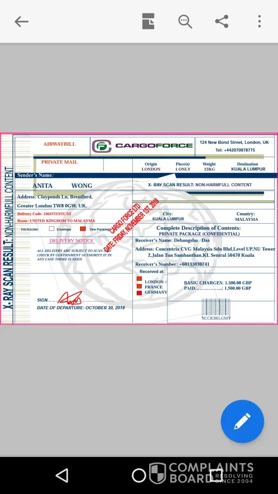Also attaching the screenshot of the so called airway bill document sent by the scammer.
