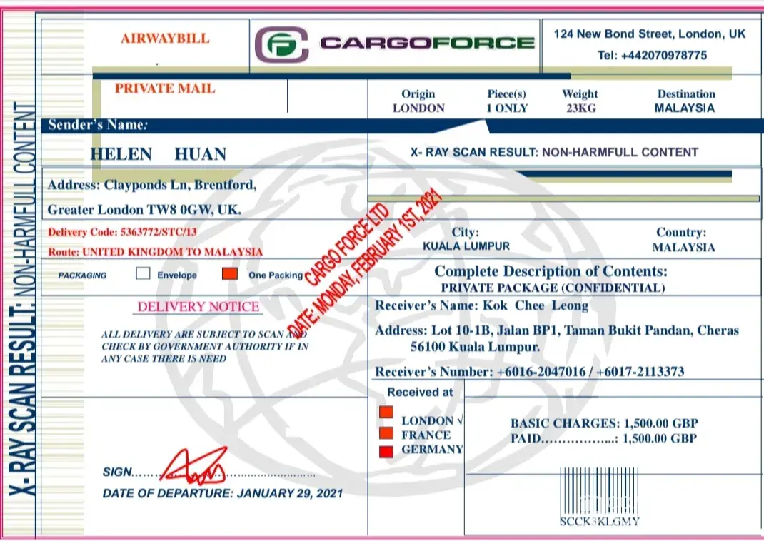 Hello honey, how are you doing and the weather over there? I have tried calling you yesterday no luck and i tried calling you few minutes ago but you didn't pick up and i felt very bad because i wanted to hear your voice and to also inform you when the package will arrive Malaysia.. Good afternoon my darling, i am in Norway dear for the business seminar/training as i told you before.. So sorry i didn't send you the information earlier on hun i was very tired yesterday and slept off after the company gave me all necessary info's. This is my lunch hour for the 1st segment of the seminar now so i have to rush and send you the information that is needed for you to claim the package because by tomorrow the package will arrive Malaysia. I just want to tell you what is inside the package i sent for you via CARGO FORCE SECURITY DELIVERY, dear inside the package i put the sum of 350, 000 Pounds inside 2 brown envelope to purchase the property and any investment that i will embark on, my hand luggage, a model Ipad 4, a wrist watch and bracelet, IPhone X, flowers, my sexy pictures, IPod music player, David Beckham Perfume and Manchester United jersey. Darling you will take from the 350, 000 Pounds and get a nice car am going to use (Honda or Toyota Camry will be okay) honey please you also book a five star hotel and keep the balance of the money in your account for my expenses when am in Malaysia..