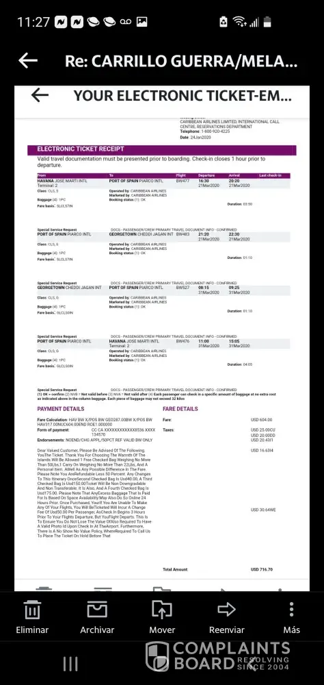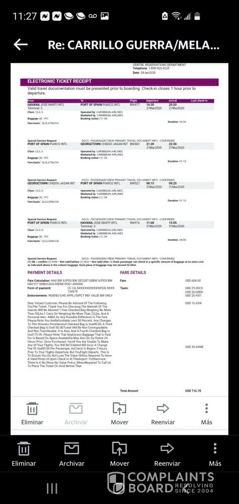A quien pueda interesar:Me llamo Esmel Abreu#tlf [protected], Resulta que mi esposa e hija tenían un vuelo de Cuba a Guyana en marzo 2020, 3 días antes de viajar nos cancelan el vuelo devido a que Guyana había cerrado sus fronteras por el Covid 19, espero unos meses para ver si reabren y nada.El 10 de noviembre del 2020 decido solicitar mi reembolso el cual tengo el recibo y en el que dice que mi dinero sería reembolsado en los próximos 90 días, luego de los 90 días e llamado en más de 30 ocasiones y siempre me dicen lo mismo que esta en proceso, que de seguro el próximo mes y nunca a sido asi, así, situación me tiene bien estresado el cual estoy pensando en demandar en las cortes de FL por todos los daños ocasiones mentalmente ya que an jugado conmigo, , me an mentido y también robado .Este próximo 10 de noviembre cumple un año de haber reclamado mi dinero y nunca e recibido ni una llamada para tan siquiera dar una explicación, tengo en mis manos todas las llamadas hechas hacia ustedes la cual fueron más de 30 en todo este tiempo y jamás me an resuelto mi problema solo mentiras.