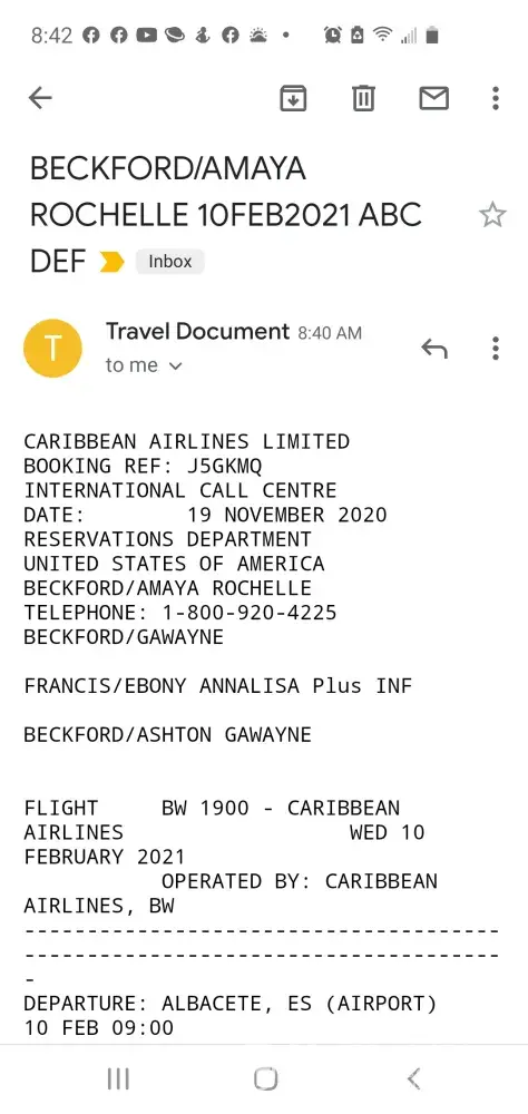 CARIBBEAN AIRLINES LIMITED BOOKING REF: WB57M7 INTERNATIONAL CALL CENTRE DATE: 11 SEPTEMBER 2020 RESERVATIONS DEPARTMENT UNITED STATES OF AMERICA MAY/ESWORTH TELEPHONE: [protected] FLIGHT BW 1900 - CARIBBEAN AIRLINES FRI 10 SEPTEMBER 2021 OPERATED BY: CARIBBEAN AIRLINES, BW ----------------------------------------------------------------------------- DEPARTURE: ALBACETE, ES (AIRPORT) 10 SEP 09:00 ARRIVAL: DEZFUL, IR (DEZFUL) 10 SEP 13:00 FLIGHT BOOKING REF: FUTUR RESERVATION CONFIRMED, ECONOMY (Y) DURATION: 01:30 - - - - - - - - - - - - - - - - - - - - - - - - - - - - - - - - - - - - - - - MEAL: NO MEAL SERVICE NON STOP ALBACETE TO DEZFUL AIRCRAFT OWNER: CARIBBEAN AIRLINES, BW EQUIPMENT: BOEING 737-800 FLIGHT TICKET(S) ----------------------------------------------------------------------------- TICKET:/ETKT 106 [protected] FOR MAY/ESWORTH GENERAL INFORMATION ----------------------------------------------------------------------------- THANK YOU FOR CHOOSING CARIBBEAN AIRLINES PLEASE BE ADVISED THAT YOUR TICKET HAS BEEN SENT FOR A REFUND