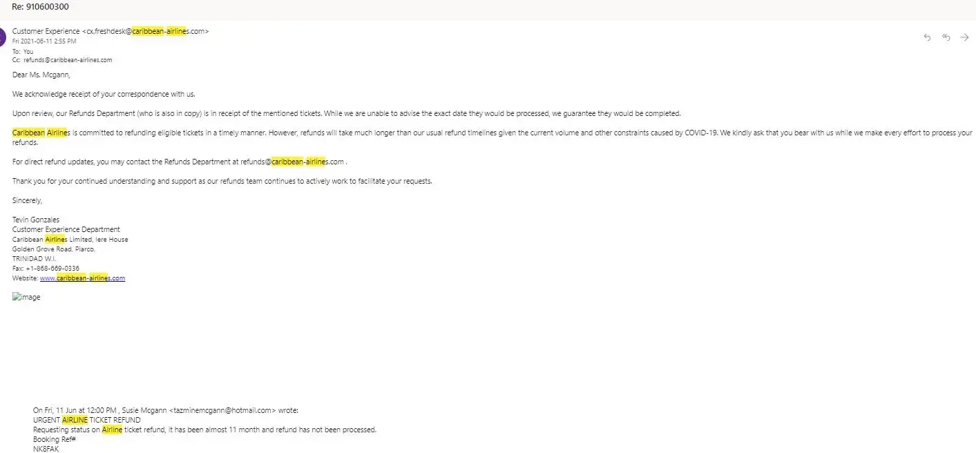 I sent the email customer-relations@caribbean-airlines.com and this issue is still not resolved. I even heard from the manager Giselle who still says my refund is being expediting but can't say when it will be processed. This makes no sense. I've Been waiting almost 7 months for my refund. Please process it ASAP