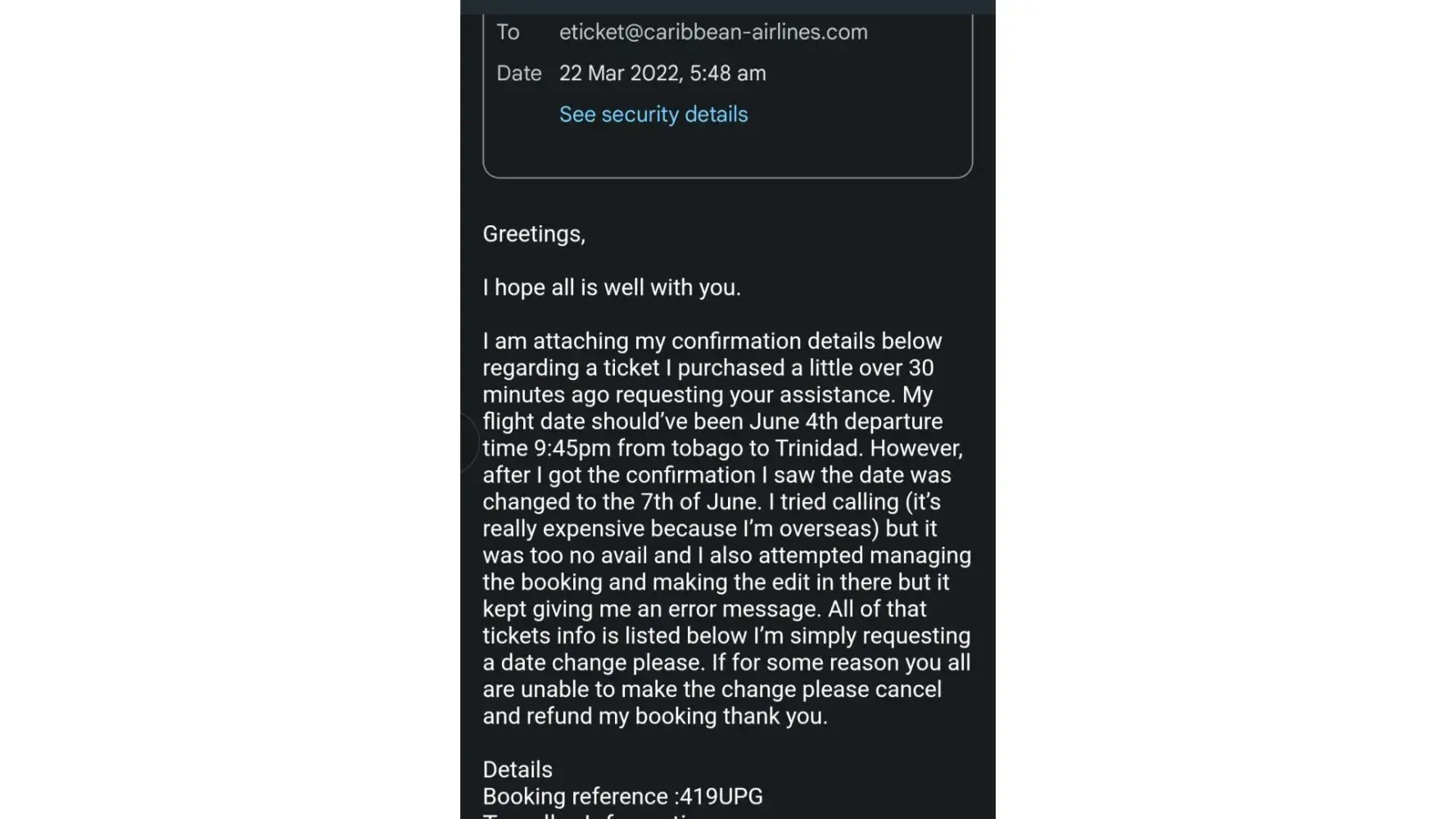 I reached out via live chat on March 22nd 2022 because I live overseas and international calls and ridiculously expensive and spoke with Reecia, while my friend simultaneously tried calling the contact center In Trinidad and was not able to get anyone. It was after 1 a.m. Trinidad time so I am unsure if that's the reason but I informed the Representative of the issue who then informed me there was availability for 3 persons on June 4th and that's why the system selected the next available date. She advised me to email [protected]@caribbeanairlines.com or [protected]@caribbeanairlines.com, which I did, I emailed both. I said I'd rather speak with someone via phone she said I can request a call in the email, which I did, no one called I received a generic response.