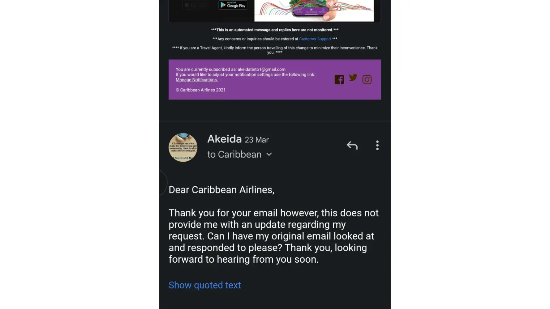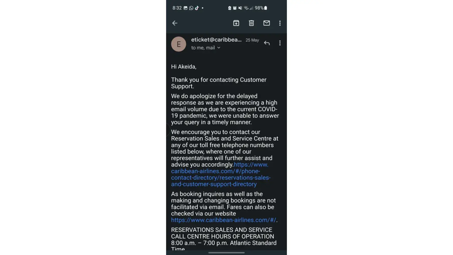 Later on May 9, 2021 I received an email from Caribbean Airlines that my flight schedule dates, arriving and departing were changed, again. At that time I called Caribbean Airlines, cancelled all tickets and requested a full refund, which Caribbean Airlines was offering customers at the time. This cancellation was done in May 9, 2021 and I received an email from Caribbean Air on May 10 2021 stating that they will be processing my refund. It is now over a year ago that I requested my refund and still have not received the refund. I am aware of several other persons who are awaiting refunds for close to a year now from this particular airline. I am appealing to you to highlight this matter in your newspaper because Caribbean Airlines is being unscrupulous and unjust to customers.