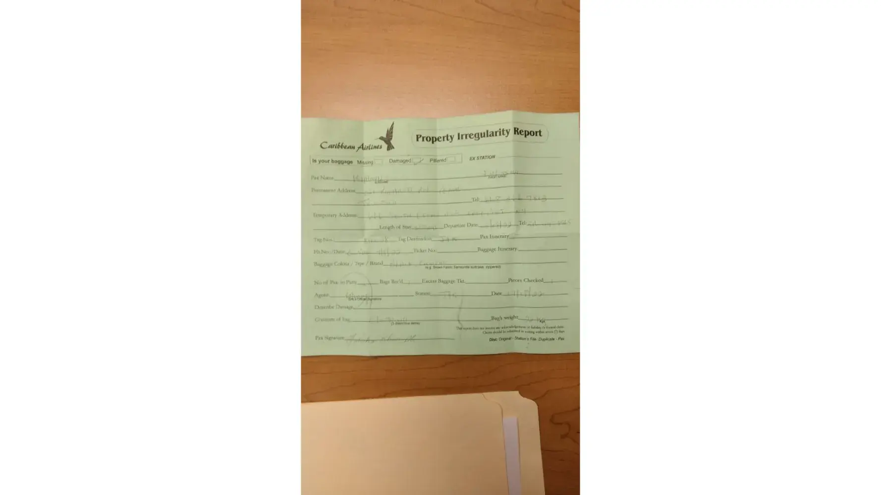 luggage was torn in three places. This is part of a 3pc set (Jessica Simpson Brand) that I purchased at Ross in Tampa, Florida and it cost me $ 150.00 US, I didn't feel the need to keep the receipt as I was returning to Trinidad. I have never experienced this as I have been travelling with Caribbean Airline for many years and as such I should be compensated.