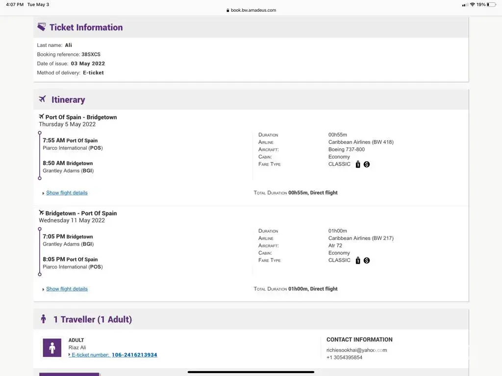 Antigua Barbados 12 May 22 BW0419 19:00 20:00 Caribbean Airlines R32RPM