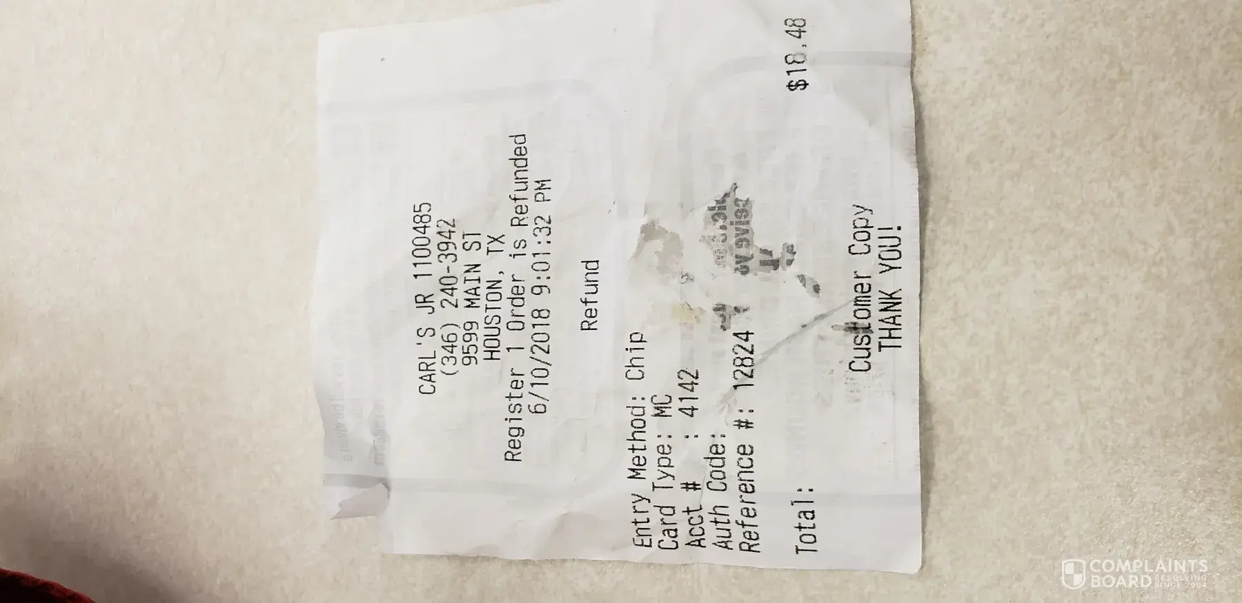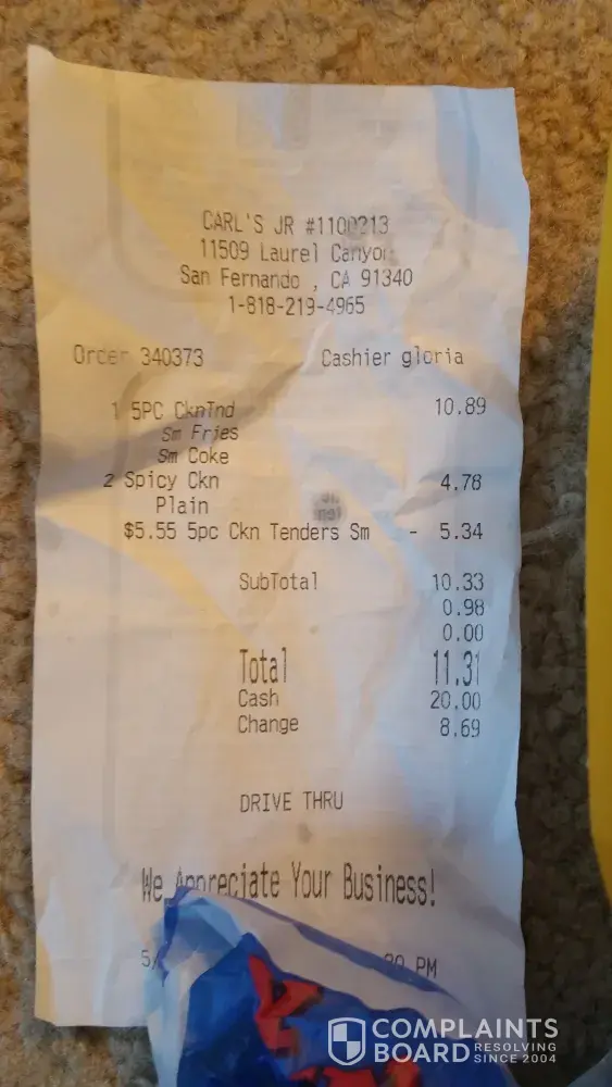A couple of weeks ago I purchased food from the Carl's Junior located at 11509 laurel canyon in San Fernandina Valley, Ca,