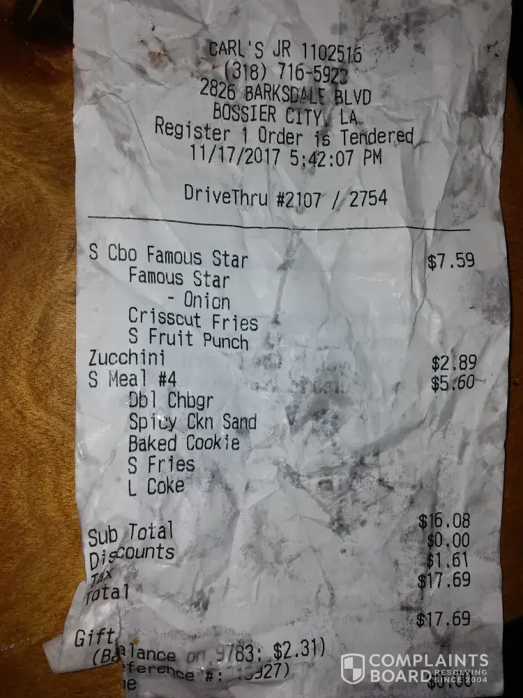 On 11/17/17 myself and my wife choose to use a gift card we received at our wedding, we ordered the 5$ combo 1 and a #4, crisscut fries and zucchini bites, when we got the order we were given a combo famous star instead with no straws