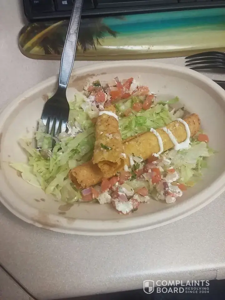 I Just visited your Santa Ana location (2511 S Bristol St, Santa Ana, CA 92704) today 10/19/17 at approximately 12:30pm, and ordered the chicken quesadilla and 3 piece chicken taquitos. The quesadilla was OK (it would have been nice to know it had onions) but the taquitos... Well, two of them were good but the center taquito had no meat in it. I'm trying to figure out how they cooked a perfectly formed taquito with no meat (I have pictures). Additionally, in preparing to leave my comments, I realized the drive-thru cashier never gave me a receipt. Lastly, In attempting to log my complaint on their web site, it would seem I can't send it... But it won't tell me why it won't go through... How convenient