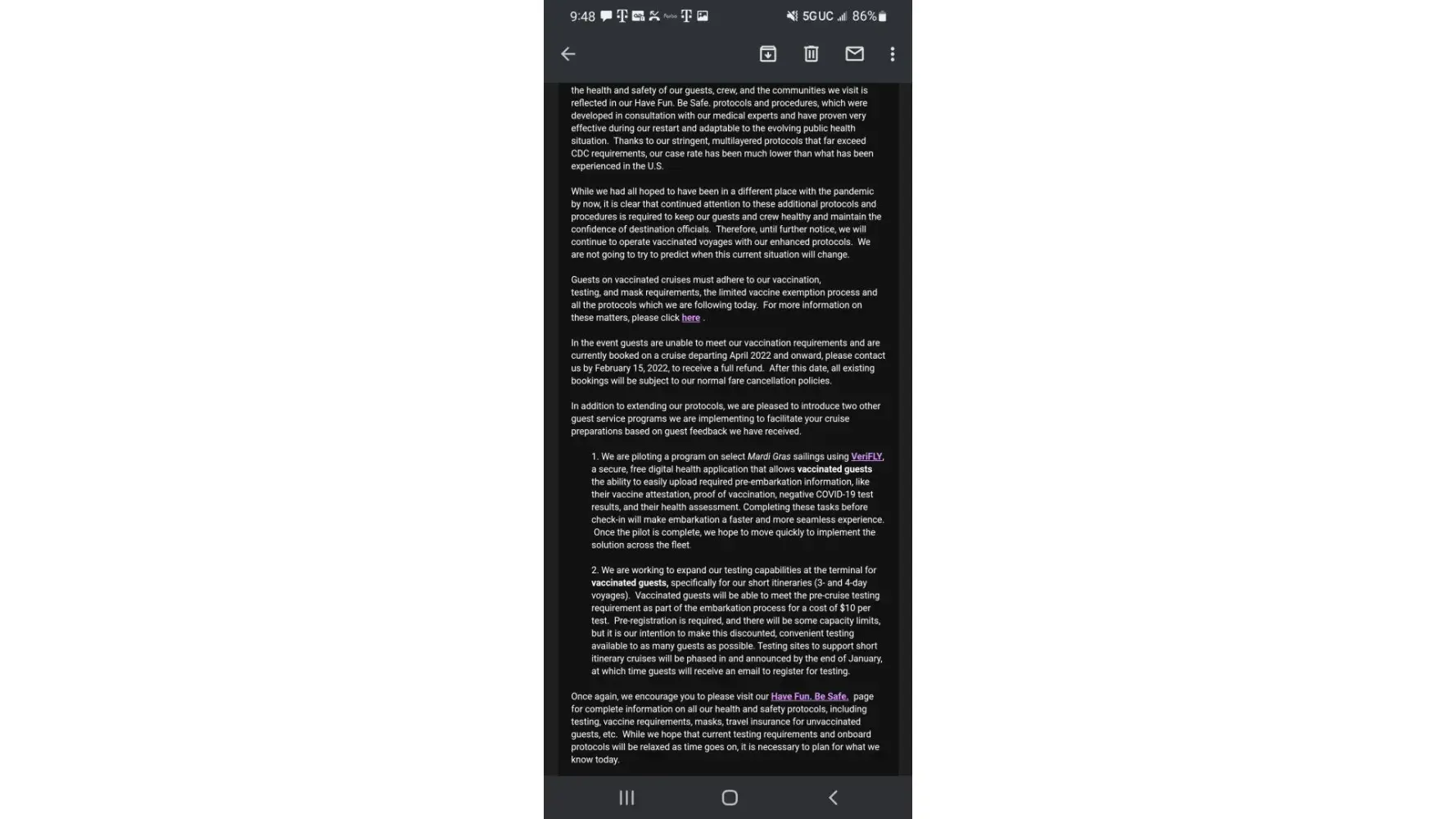 My emails to Carnival Customer Care ([protected]@carnival.com) go unanswered, as all I get is a canned, generic response.