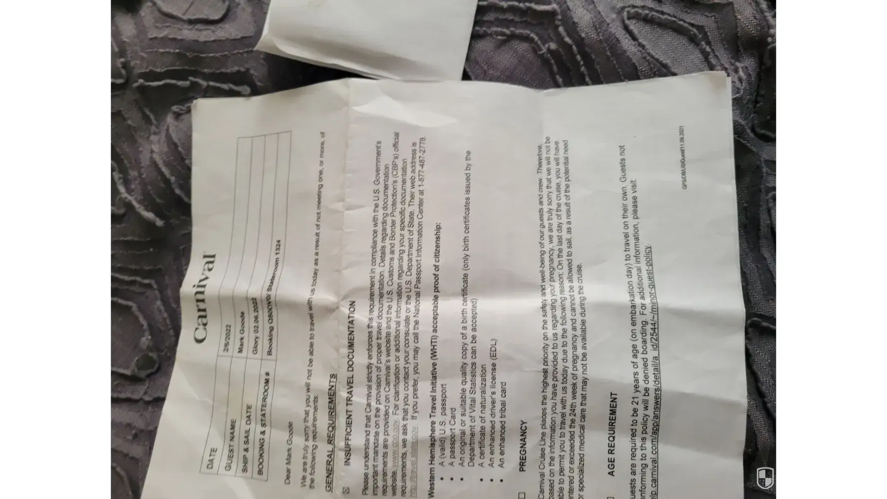 Q50DV0,-Q62VT2, are the booking numbers for this cruise I was not allowed to take, due to an over zealous agent at boarding. I have several pieces of identification, drivers license, trade license with current photo none was good enough for her.