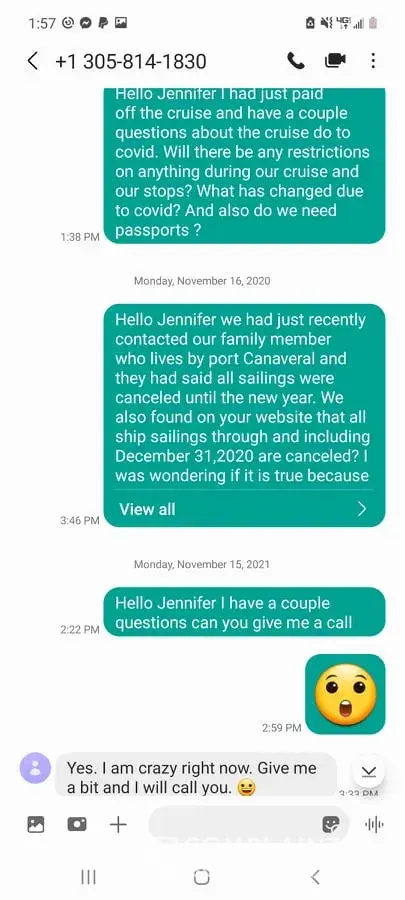 Still no response on any excursions, still no response on why we were changed to a destination 40 miles from Miami, Still no response on why my travel agent hasn't even told me anything about this. I have contacted my travel agent roughly 15 times over the course of two years trying to plan this cruise and I've gotten 2 responses over the course of two years. Once again Ill be planning trips outside of cruises because of this experience. I am better off going to the island via plane and not getting tossed around like a rag doll for my cash. Here is a picture of how horrible your travel agents are at responding to people over the course of almost 2 years!