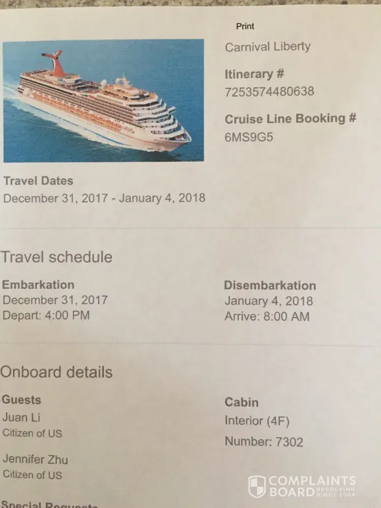 On Mar. 21 2017, I booked a Carnival Liberty 4-nights Bahamas cruise from port Canaveral from Dec. 31 2017 to Jan. 4th 2018 for my daughter and myself through Expedia. The $300 deposit was made on the same day. Originally, I had provided a Visa card, then I switched to MasterCard for the $300 deposit.