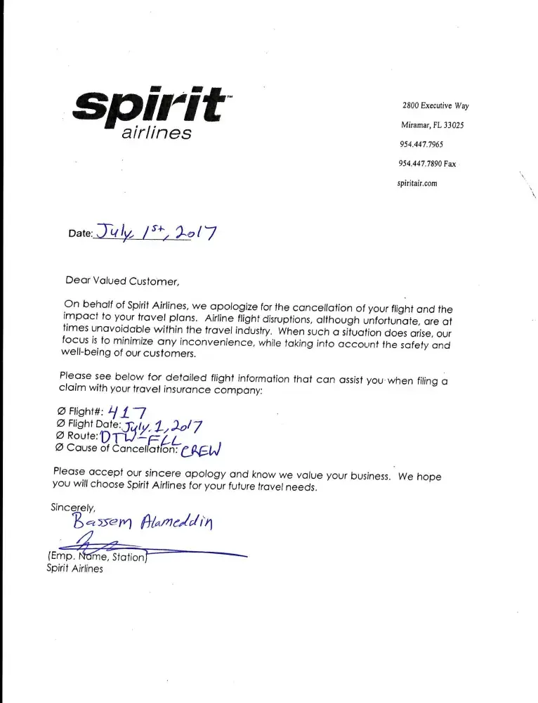 We booked a 5 Day Exotic Eastern Caribbean Cruise – Booking Number 7PNOV9. Our trip Sail Date is today 7/1/17. This morning when we arrived at the airport our flight was cancelled due to crew problems. We were told there were no available flights until the evening. Which means we would have missed the ship's Boarding Time. We received a letter of apology from Spirit Airlines, which is attached. We are requesting a voucher or credit for a future cruise because our cruise was cancelled due to no fault of ours. The airline refunded me with airfare credits.