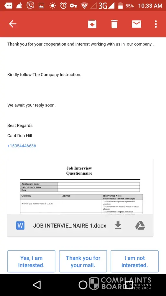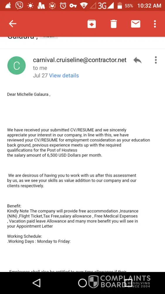 I just want to ask about the email that I recieved about last week ago.It was a job offer from carnival.[protected]@contrator .net.Can u just confirm it for me to clarrify if its real, or scam?